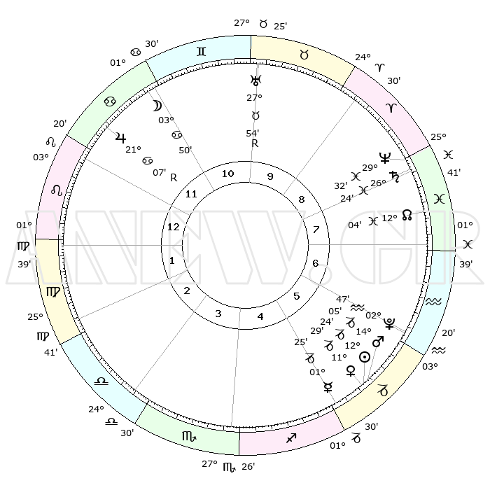 | | ΘΕΣΕΙΣ ΠΛΑΝΗΤΩΝ ΑΣΤΡΟΛΟΓΙΚΟΥ ΧΑΡΤΗ ΤΗΣ ΣΤΙΓΜΗΣ ΑΥΤΗΣ | | | | Πλανήτης | Ζώδιο | Μοίρες | Δεκαήμ. | Σε οίκο | Απόκλιση | | Ακμές των οίκων | | Ηλιος | Αιγόκερως | 12°20' | Δεύτερο | 6 | 22 S 52 | | 1ος | 11°07' | Λέων | | Σελήνη | Καρκίνος | 02°46' | Πρώτο | 11 | 28 N 06 | | 2ος | 03°03' | Παρθένος | | Ερμής | Αιγόκερως | 01°19' | Πρώτο | 5 | 24 S 11 | | 3ος | 29°35' | Παρθένος | | Αφροδίτη | Αιγόκερως | 11°24' | Δεύτερο | 6 | 23 S 31 | | 4ος | 01°45' | Σκορπιός | | Αρης | Αιγόκερως | 14°02' | Δεύτερο | 6 | 23 S 35 | | 5ος | 07°17' | Τοξότης | | Δίας | Καρκίνος | 21°08'R | Τρίτο | 12 | 22 N 01 | | 6ος | 11°17' | Αιγόκερως | | Κρόνος | Ιχθείς | 26°23' | Τρίτο | 8 | 03 S 30 | | 7ος | 11°07' | Υδροχόος | | Ουρανός | Ταύρος | 27°54'R | Τρίτο | 10 | 19 N 30 | | 8ος | 03°03' | Ιχθείς | | Ποσειδώνας | Ιχθείς | 29°32' | Τρίτο | 8 | 01 S 24 | | 9ος | 29°35' | Ιχθείς | | Πλούτωνας | Υδροχόος | 02°46' | Πρώτο | 6 | 23 S 12 | | 10ος | 01°45' | Ταύρος | | Β. Δεσμός | Ιχθείς | 12°05' | Δεύτερο | 8 | 07 S 02 | | 11ος | 07°17' | Δίδυμοι | | Ωροσκόπος | Λέων | 11°07' | Δεύτερο | | | 12ος | 11°17' | Καρκίνος | | Μεσουράνημα | Ταύρος | 01°45' | Πρώτο | | | |
