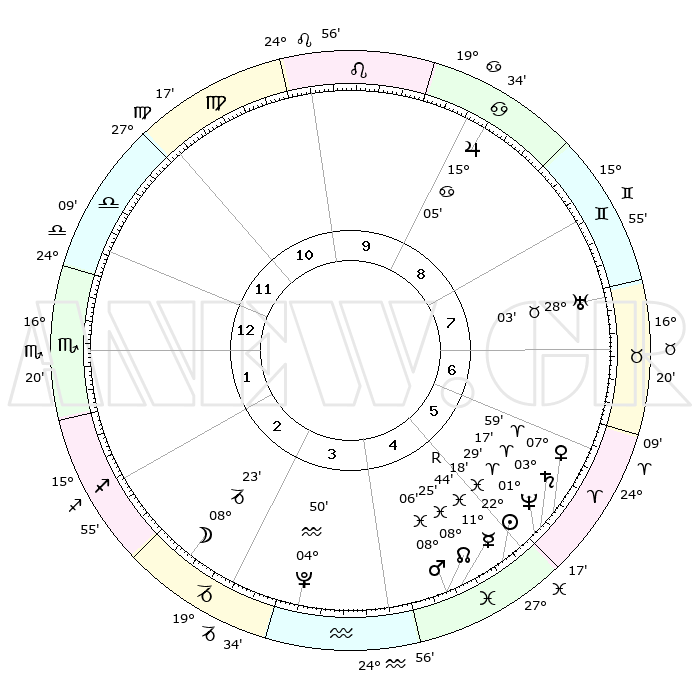 | | ΘΕΣΕΙΣ ΠΛΑΝΗΤΩΝ ΑΣΤΡΟΛΟΓΙΚΟΥ ΧΑΡΤΗ ΤΗΣ ΣΤΙΓΜΗΣ ΑΥΤΗΣ | | | | Πλανήτης | Ζώδιο | Μοίρες | Δεκαήμ. | Σε οίκο | Απόκλιση | | Ακμές των οίκων | | Ηλιος | Ιχθείς | 22°13' | Τρίτο | 5 | 03 S 05 | | 1ος | 24°45' | Ζυγός | | Σελήνη | Αιγόκερως | 07°29' | Πρώτο | 3 | 27 S 51 | | 2ος | 22°52' | Σκορπιός | | Ερμής | Ιχθείς | 11°48'R | Δεύτερο | 5 | 04 S 27 | | 3ος | 24°26' | Τοξότης | | Αφροδίτη | Κριός | 07°54' | Πρώτο | 6 | 02 N 07 | | 4ος | 28°18' | Αιγόκερως | | Αρης | Ιχθείς | 08°03' | Πρώτο | 5 | 09 S 34 | | 5ος | 01°15' | Ιχθείς | | Δίας | Καρκίνος | 15°05' | Δεύτερο | 9 | 22 N 56 | | 6ος | 00°21' | Κριός | | Κρόνος | Κριός | 03°16' | Πρώτο | 6 | 00 S 39 | | 7ος | 24°45' | Κριός | | Ουρανός | Ταύρος | 28°03' | Τρίτο | 8 | 19 N 33 | | 8ος | 22°52' | Ταύρος | | Ποσειδώνας | Κριός | 01°29' | Πρώτο | 6 | 00 S 36 | | 9ος | 24°26' | Δίδυμοι | | Πλούτωνας | Υδροχόος | 04°50' | Πρώτο | 4 | 22 S 50 | | 10ος | 28°18' | Καρκίνος | | Β. Δεσμός | Ιχθείς | 08°25' | Πρώτο | 5 | 08 S 25 | | 11ος | 01°15' | Παρθένος | | Ωροσκόπος | Ζυγός | 24°45' | Τρίτο | | | 12ος | 00°21' | Ζυγός | | Μεσουράνημα | Καρκίνος | 28°18' | Τρίτο | | | |