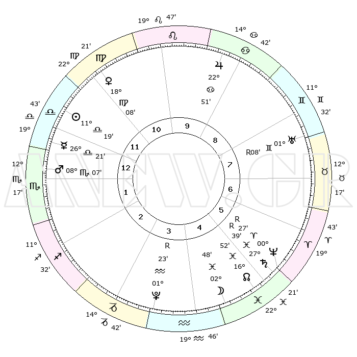 | ΘΕΣΕΙΣ ΠΛΑΝΗΤΩΝ ΑΣΤΡΟΛΟΓΙΚΟΥ ΧΑΡΤΗ ΤΗΣ ΣΤΙΓΜΗΣ ΑΥΤΗΣ | | Πλανήτης | Ζώδιο | Μοίρες | Δεκαήμ. | Σε οίκο | Απόκλιση | | Ακμές των οίκων | Ηλιος | Ζυγός | 11°13' | Δεύτερο | 1 | 04 S 26 | | 1ος | 11°05' | Ζυγός | Σελήνη | Ιχθείς | 01°20' | Πρώτο | 5 | 12 S 26 | | 2ος | 08°25' | Σκορπιός | Ερμής | Ζυγός | 26°11' | Τρίτο | 1 | 10 S 33 | | 3ος | 09°17' | Τοξότης | Αφροδίτη | Παρθένος | 18°00' | Δεύτερο | 12 | 05 N 59 | | 4ος | 12°30' | Αιγόκερως | Αρης | Σκορπιός | 08°03' | Πρώτο | 1 | 14 S 18 | | 5ος | 15°26' | Υδροχόος | Δίας | Καρκίνος | 22°51' | Τρίτο | 10 | 21 N 31 | | 6ος | 15°23' | Ιχθείς | Κρόνος | Ιχθείς | 27°39'R | Τρίτο | 6 | 03 S 14 | | 7ος | 11°05' | Κριός | Ουρανός | Δίδυμοι | 01°08'R | Πρώτο | 8 | 20 N 11 | | 8ος | 08°25' | Ταύρος | Ποσειδώνας | Κριός | 00°28'R | Πρώτο | 6 | 01 S 05 | | 9ος | 09°17' | Δίδυμοι | Πλούτωνας | Υδροχόος | 01°23'R | Πρώτο | 4 | 23 S 32 | | 10ος | 12°30' | Καρκίνος | Β. Δεσμός | Ιχθείς | 16°52' | Δεύτερο | 6 | 05 S 11 | | 11ος | 15°26' | Λέων | Ωροσκόπος | Ζυγός | 11°05' | Δεύτερο | | | 12ος | 15°23' | Παρθένος | Μεσουράνημα | Καρκίνος | 12°30' | Δεύτερο | | | |