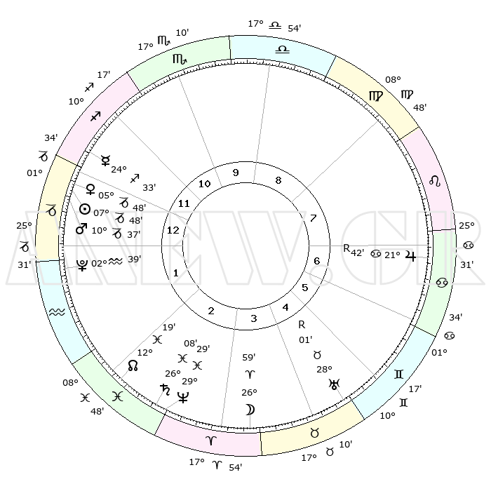 | | ΘΕΣΕΙΣ ΠΛΑΝΗΤΩΝ ΑΣΤΡΟΛΟΓΙΚΟΥ ΧΑΡΤΗ ΤΗΣ ΣΤΙΓΜΗΣ ΑΥΤΗΣ | | | | Πλανήτης | Ζώδιο | Μοίρες | Δεκαήμ. | Σε οίκο | Απόκλιση | | Ακμές των οίκων | | Ηλιος | Αιγόκερως | 07°44' | Πρώτο | 1 | 23 S 12 | | 1ος | 27°37' | Τοξότης | | Σελήνη | Κριός | 25°53' | Τρίτο | 4 | 13 N 19 | | 2ος | 04°11' | Υδροχόος | | Ερμής | Τοξότης | 24°26' | Τρίτο | 12 | 23 S 34 | | 3ος | 13°59' | Ιχθείς | | Αφροδίτη | Αιγόκερως | 05°42' | Πρώτο | 1 | 23 S 43 | | 4ος | 18°17' | Κριός | | Αρης | Αιγόκερως | 10°34' | Δεύτερο | 1 | 23 S 53 | | 5ος | 14°59' | Ταύρος | | Δίας | Καρκίνος | 21°43'R | Τρίτο | 7 | 21 N 55 | | 6ος | 06°57' | Δίδυμοι | | Κρόνος | Ιχθείς | 26°08' | Τρίτο | 3 | 03 S 37 | | 7ος | 27°37' | Δίδυμοι | | Ουρανός | Ταύρος | 28°01'R | Τρίτο | 5 | 19 N 31 | | 8ος | 04°10' | Λέων | | Ποσειδώνας | Ιχθείς | 29°29' | Τρίτο | 3 | 01 S 26 | | 9ος | 13°59' | Παρθένος | | Πλούτωνας | Υδροχόος | 02°38' | Πρώτο | 1 | 23 S 14 | | 10ος | 18°17' | Ζυγός | | Β. Δεσμός | Ιχθείς | 12°19' | Δεύτερο | 2 | 06 S 56 | | 11ος | 14°59' | Σκορπιός | | Ωροσκόπος | Τοξότης | 27°37' | Τρίτο | | | 12ος | 06°57' | Τοξότης | | Μεσουράνημα | Ζυγός | 18°17' | Δεύτερο | | | |