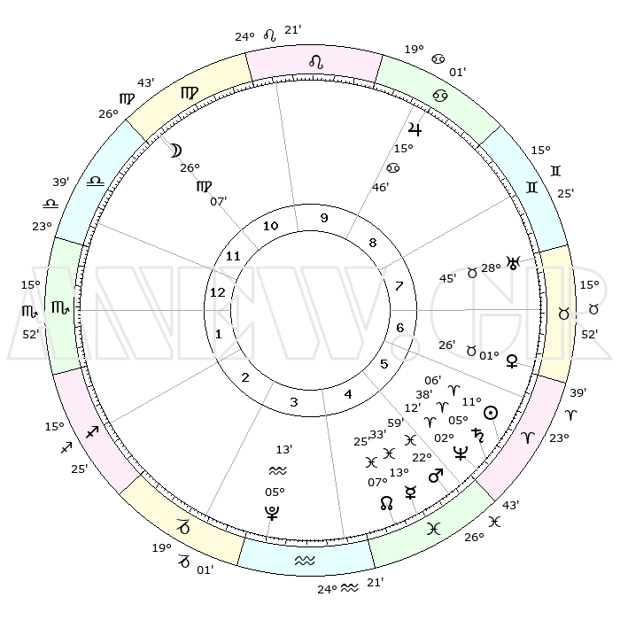 | | ΘΕΣΕΙΣ ΠΛΑΝΗΤΩΝ ΑΣΤΡΟΛΟΓΙΚΟΥ ΧΑΡΤΗ ΤΗΣ ΣΤΙΓΜΗΣ ΑΥΤΗΣ | | | | Πλανήτης | Ζώδιο | Μοίρες | Δεκαήμ. | Σε οίκο | Απόκλιση | | Ακμές των οίκων | | Ηλιος | Κριός | 11°02' | Δεύτερο | 6 | 04 N 22 | | 1ος | 26°43' | Ζυγός | | Σελήνη | Παρθένος | 25°16' | Τρίτο | 11 | 00 N 31 | | 2ος | 24°56' | Σκορπιός | | Ερμής | Ιχθείς | 13°30' | Δεύτερο | 5 | 07 S 39 | | 3ος | 26°39' | Τοξότης | | Αφροδίτη | Ταύρος | 01°21' | Πρώτο | 7 | 11 N 31 | | 4ος | 00°38' | Υδροχόος | | Αρης | Ιχθείς | 22°56' | Τρίτο | 5 | 03 S 46 | | 5ος | 03°34' | Ιχθείς | | Δίας | Καρκίνος | 15°46' | Δεύτερο | 9 | 22 N 52 | | 6ος | 02°32' | Κριός | | Κρόνος | Κριός | 05°38' | Πρώτο | 6 | 00 N 17 | | 7ος | 26°43' | Κριός | | Ουρανός | Ταύρος | 28°45' | Τρίτο | 8 | 19 N 43 | | 8ος | 24°56' | Ταύρος | | Ποσειδώνας | Κριός | 02°12' | Πρώτο | 5 | 00 S 20 | | 9ος | 26°39' | Δίδυμοι | | Πλούτωνας | Υδροχόος | 05°13' | Πρώτο | 4 | 22 S 47 | | 10ος | 00°38' | Λέων | | Β. Δεσμός | Ιχθείς | 07°25' | Πρώτο | 5 | 08 S 47 | | 11ος | 03°34' | Παρθένος | | Ωροσκόπος | Ζυγός | 26°43' | Τρίτο | | | 12ος | 02°32' | Ζυγός | | Μεσουράνημα | Λέων | 00°38' | Πρώτο | | | |