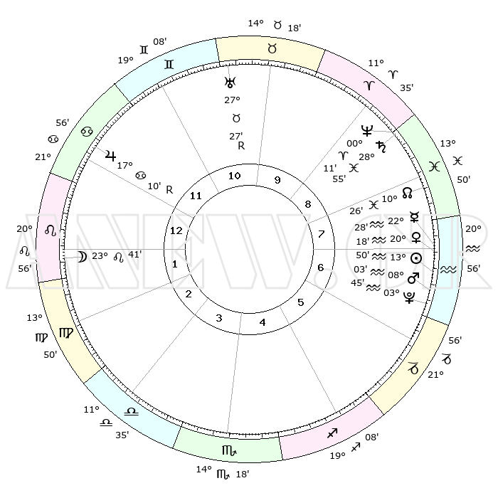 | | ΘΕΣΕΙΣ ΠΛΑΝΗΤΩΝ ΑΣΤΡΟΛΟΓΙΚΟΥ ΧΑΡΤΗ ΤΗΣ ΣΤΙΓΜΗΣ ΑΥΤΗΣ | | | | Πλανήτης | Ζώδιο | Μοίρες | Δεκαήμ. | Σε οίκο | Απόκλιση | | Ακμές των οίκων | | Ηλιος | Υδροχόος | 13°46' | Δεύτερο | 7 | 16 S 41 | | 1ος | 03°38' | Λέων | | Σελήνη | Λέων | 22°51' | Τρίτο | 1 | 15 N 17 | | 2ος | 24°56' | Λέων | | Ερμής | Υδροχόος | 22°21' | Τρίτο | 7 | 15 S 44 | | 3ος | 20°28' | Παρθένος | | Αφροδίτη | Υδροχόος | 20°13' | Τρίτο | 7 | 16 S 03 | | 4ος | 21°56' | Ζυγός | | Αρης | Υδροχόος | 08°00' | Πρώτο | 7 | 19 S 16 | | 5ος | 27°52' | Σκορπιός | | Δίας | Καρκίνος | 17°11'R | Δεύτερο | 12 | 22 N 38 | | 6ος | 02°59' | Αιγόκερως | | Κρόνος | Ιχθείς | 28°55' | Τρίτο | 9 | 02 S 25 | | 7ος | 03°38' | Υδροχόος | | Ουρανός | Ταύρος | 27°27'R | Τρίτο | 10 | 19 N 24 | | 8ος | 24°56' | Υδροχόος | | Ποσειδώνας | Κριός | 00°11' | Πρώτο | 9 | 01 S 08 | | 9ος | 20°28' | Ιχθείς | | Πλούτωνας | Υδροχόος | 03°45' | Πρώτο | 7 | 23 S 01 | | 10ος | 21°56' | Κριός | | Β. Δεσμός | Ιχθείς | 10°27' | Δεύτερο | 8 | 07 S 39 | | 11ος | 27°52' | Ταύρος | | Ωροσκόπος | Λέων | 03°38' | Πρώτο | | | 12ος | 02°59' | Καρκίνος | | Μεσουράνημα | Κριός | 21°56' | Τρίτο | | | |