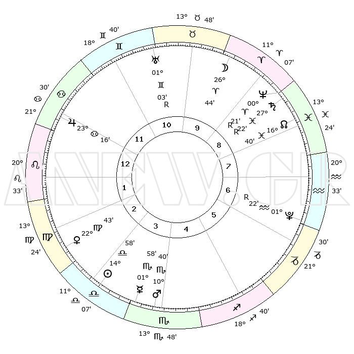 | ΘΕΣΕΙΣ ΠΛΑΝΗΤΩΝ ΑΣΤΡΟΛΟΓΙΚΟΥ ΧΑΡΤΗ ΤΗΣ ΣΤΙΓΜΗΣ ΑΥΤΗΣ | | Πλανήτης | Ζώδιο | Μοίρες | Δεκαήμ. | Σε οίκο | Απόκλιση | | Ακμές των οίκων | Ηλιος | Ζυγός | 14°54' | Δεύτερο | 4 | 05 S 52 | | 1ος | 27°45' | Καρκίνος | Σελήνη | Κριός | 25°34' | Τρίτο | 10 | 12 N 50 | | 2ος | 18°39' | Λέων | Ερμής | Σκορπιός | 01°51' | Πρώτο | 4 | 12 S 59 | | 3ος | 13°24' | Παρθένος | Αφροδίτη | Παρθένος | 22°37' | Τρίτο | 3 | 04 N 14 | | 4ος | 14°09' | Ζυγός | Αρης | Σκορπιός | 10°37' | Δεύτερο | 4 | 15 S 09 | | 5ος | 20°14' | Σκορπιός | Δίας | Καρκίνος | 23°15' | Τρίτο | 12 | 21 N 28 | | 6ος | 26°18' | Τοξότης | Κρόνος | Ιχθείς | 27°23'R | Τρίτο | 9 | 03 S 21 | | 7ος | 27°45' | Αιγόκερως | Ουρανός | Δίδυμοι | 01°03'R | Πρώτο | 11 | 20 N 09 | | 8ος | 18°39' | Υδροχόος | Ποσειδώνας | Κριός | 00°22'R | Πρώτο | 9 | 01 S 07 | | 9ος | 13°24' | Ιχθείς | Πλούτωνας | Υδροχόος | 01°22'R | Πρώτο | 7 | 23 S 32 | | 10ος | 14°09' | Κριός | Β. Δεσμός | Ιχθείς | 16°40' | Δεύτερο | 9 | 05 S 16 | | 11ος | 20°14' | Ταύρος | Ωροσκόπος | Καρκίνος | 27°45' | Τρίτο | | | 12ος | 26°18' | Δίδυμοι | Μεσουράνημα | Κριός | 14°09' | Δεύτερο | | | |