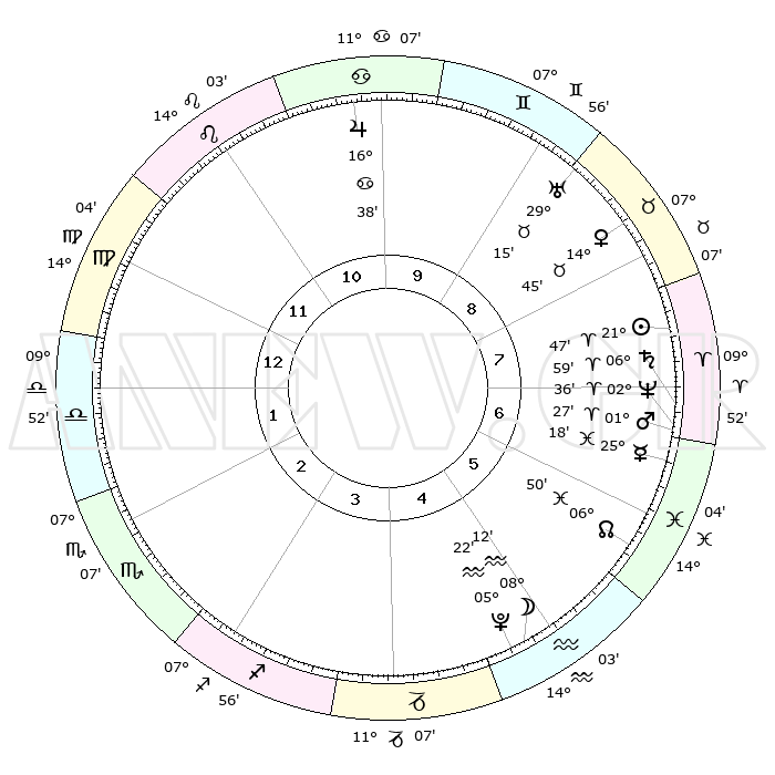 | | ΘΕΣΕΙΣ ΠΛΑΝΗΤΩΝ ΑΣΤΡΟΛΟΓΙΚΟΥ ΧΑΡΤΗ ΤΗΣ ΣΤΙΓΜΗΣ ΑΥΤΗΣ | | | | Πλανήτης | Ζώδιο | Μοίρες | Δεκαήμ. | Σε οίκο | Απόκλιση | | Ακμές των οίκων | | Ηλιος | Κριός | 21°43' | Τρίτο | 8 | 08 N 28 | | 1ος | 19°49' | Παρθένος | | Σελήνη | Υδροχόος | 07°22' | Πρώτο | 5 | 20 S 59 | | 2ος | 15°35' | Ζυγός | | Ερμής | Ιχθείς | 25°13' | Τρίτο | 7 | 04 S 08 | | 3ος | 15°36' | Σκορπιός | | Αφροδίτη | Ταύρος | 14°40' | Δεύτερο | 8 | 16 N 15 | | 4ος | 18°31' | Τοξότης | | Αρης | Κριός | 01°24' | Πρώτο | 7 | 00 S 22 | | 5ος | 21°43' | Αιγόκερως | | Δίας | Καρκίνος | 16°38' | Δεύτερο | 10 | 22 N 46 | | 6ος | 22°33' | Υδροχόος | | Κρόνος | Κριός | 06°58' | Πρώτο | 7 | 00 N 48 | | 7ος | 19°49' | Ιχθείς | | Ουρανός | Ταύρος | 29°15' | Τρίτο | 9 | 19 N 49 | | 8ος | 15°35' | Κριός | | Ποσειδώνας | Κριός | 02°36' | Πρώτο | 7 | 00 S 10 | | 9ος | 15°36' | Ταύρος | | Πλούτωνας | Υδροχόος | 05°22' | Πρώτο | 5 | 22 S 47 | | 10ος | 18°31' | Δίδυμοι | | Β. Δεσμός | Ιχθείς | 06°51' | Πρώτο | 6 | 09 S 00 | | 11ος | 21°43' | Καρκίνος | | Ωροσκόπος | Παρθένος | 19°49' | Δεύτερο | | | 12ος | 22°33' | Λέων | | Μεσουράνημα | Δίδυμοι | 18°31' | Δεύτερο | | | |