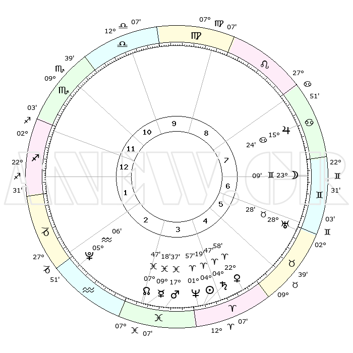 | | ΘΕΣΕΙΣ ΠΛΑΝΗΤΩΝ ΑΣΤΡΟΛΟΓΙΚΟΥ ΧΑΡΤΗ ΤΗΣ ΣΤΙΓΜΗΣ ΑΥΤΗΣ | | | | Πλανήτης | Ζώδιο | Μοίρες | Δεκαήμ. | Σε οίκο | Απόκλιση | | Ακμές των οίκων | | Ηλιος | Κριός | 04°15' | Πρώτο | 4 | 01 N 41 | | 1ος | 29°53' | Σκορπιός | | Σελήνη | Δίδυμοι | 22°05' | Τρίτο | 7 | 28 N 16 | | 2ος | 00°59' | Αιγόκερως | | Ερμής | Ιχθείς | 09°16' | Πρώτο | 3 | 08 S 04 | | 3ος | 06°40' | Υδροχόος | | Αφροδίτη | Κριός | 22°52' | Τρίτο | 5 | 08 N 13 | | 4ος | 12°43' | Ιχθείς | | Αρης | Ιχθείς | 17°33' | Δεύτερο | 4 | 05 S 54 | | 5ος | 13°46' | Κριός | | Δίας | Καρκίνος | 15°23' | Δεύτερο | 8 | 22 N 54 | | 6ος | 08°50' | Ταύρος | | Κρόνος | Κριός | 04°46' | Πρώτο | 4 | 00 S 03 | | 7ος | 29°53' | Ταύρος | | Ουρανός | Ταύρος | 28°28' | Τρίτο | 6 | 19 N 39 | | 8ος | 00°59' | Καρκίνος | | Ποσειδώνας | Κριός | 01°56' | Πρώτο | 4 | 00 S 26 | | 9ος | 06°40' | Λέων | | Πλούτωνας | Υδροχόος | 05°06' | Πρώτο | 2 | 22 S 48 | | 10ος | 12°43' | Παρθένος | | Β. Δεσμός | Ιχθείς | 07°47' | Πρώτο | 3 | 08 S 39 | | 11ος | 13°46' | Ζυγός | | Ωροσκόπος | Σκορπιός | 29°53' | Τρίτο | | | 12ος | 08°50' | Σκορπιός | | Μεσουράνημα | Παρθένος | 12°43' | Δεύτερο | | | |