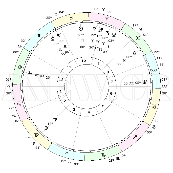 | | ΘΕΣΕΙΣ ΠΛΑΝΗΤΩΝ ΑΣΤΡΟΛΟΓΙΚΟΥ ΧΑΡΤΗ ΤΗΣ ΣΤΙΓΜΗΣ ΑΥΤΗΣ | | | | Πλανήτης | Ζώδιο | Μοίρες | Δεκαήμ. | Σε οίκο | Απόκλιση | | Ακμές των οίκων | | Ηλιος | Ταύρος | 07°05' | Πρώτο | 11 | 13 N 52 | | 1ος | 13°27' | Καρκίνος | | Σελήνη | Παρθένος | 16°36' | Δεύτερο | 3 | 04 N 32 | | 2ος | 03°52' | Λέων | | Ερμής | Κριός | 19°19' | Δεύτερο | 10 | 05 N 27 | | 3ος | 26°51' | Λέων | | Αφροδίτη | Δίδυμοι | 03°51' | Πρώτο | 11 | 21 N 38 | | 4ος | 25°24' | Παρθένος | | Αρης | Κριός | 13°34' | Δεύτερο | 10 | 04 N 31 | | 5ος | 00°60' | Σκορπιός | | Δίας | Καρκίνος | 18°25' | Δεύτερο | 1 | 22 N 33 | | 6ος | 09°27' | Τοξότης | | Κρόνος | Κριός | 08°51' | Πρώτο | 10 | 01 N 31 | | 7ος | 13°27' | Αιγόκερως | | Ουρανός | Δίδυμοι | 00°05' | Πρώτο | 11 | 20 N 00 | | 8ος | 03°52' | Υδροχόος | | Ποσειδώνας | Κριός | 03°09' | Πρώτο | 10 | 00 N 02 | | 9ος | 26°51' | Υδροχόος | | Πλούτωνας | Υδροχόος | 05°29' | Πρώτο | 8 | 22 S 48 | | 10ος | 25°24' | Ιχθείς | | Β. Δεσμός | Ιχθείς | 06°01' | Πρώτο | 9 | 09 S 18 | | 11ος | 00°60' | Ταύρος | | Ωροσκόπος | Καρκίνος | 13°27' | Δεύτερο | | | 12ος | 09°27' | Δίδυμοι | | Μεσουράνημα | Ιχθείς | 25°24' | Τρίτο | | | |