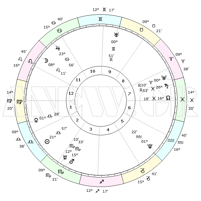 | ΘΕΣΕΙΣ ΠΛΑΝΗΤΩΝ ΑΣΤΡΟΛΟΓΙΚΟΥ ΧΑΡΤΗ ΤΗΣ ΣΤΙΓΜΗΣ ΑΥΤΗΣ | | Πλανήτης | Ζώδιο | Μοίρες | Δεκαήμ. | Σε οίκο | Απόκλιση | | Ακμές των οίκων | Ηλιος | Ζυγός | 21°46' | Τρίτο | 4 | 08 S 29 | | 1ος | 20°27' | Καρκίνος | Σελήνη | Λέων | 05°45' | Πρώτο | 1 | 22 N 14 | | 2ος | 11°01' | Λέων | Ερμής | Σκορπιός | 11°54' | Δεύτερο | 5 | 17 S 02 | | 3ος | 04°48' | Παρθένος | Αφροδίτη | Ζυγός | 01°15' | Πρώτο | 3 | 00 N 54 | | 4ος | 04°30' | Ζυγός | Αρης | Σκορπιός | 15°25' | Δεύτερο | 5 | 16 S 40 | | 5ος | 10°30' | Σκορπιός | Δίας | Καρκίνος | 23°55' | Τρίτο | 1 | 21 N 22 | | 6ος | 17°49' | Τοξότης | Κρόνος | Ιχθείς | 26°54'R | Τρίτο | 9 | 03 S 32 | | 7ος | 20°27' | Αιγόκερως | Ουρανός | Δίδυμοι | 00°51'R | Πρώτο | 11 | 20 N 07 | | 8ος | 11°01' | Υδροχόος | Ποσειδώνας | Κριός | 00°11'R | Πρώτο | 9 | 01 S 11 | | 9ος | 04°48' | Ιχθείς | Πλούτωνας | Υδροχόος | 01°22' | Πρώτο | 7 | 23 S 32 | | 10ος | 04°30' | Κριός | Β. Δεσμός | Ιχθείς | 16°18' | Δεύτερο | 9 | 05 S 24 | | 11ος | 10°30' | Ταύρος | Ωροσκόπος | Καρκίνος | 20°27' | Τρίτο | | | 12ος | 17°49' | Δίδυμοι | Μεσουράνημα | Κριός | 04°30' | Πρώτο | | | |
