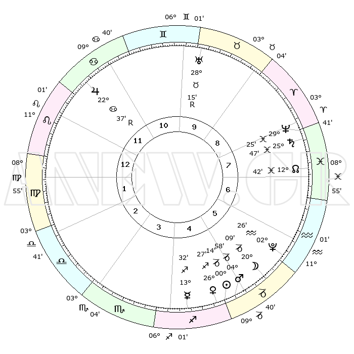 | | ΘΕΣΕΙΣ ΠΛΑΝΗΤΩΝ ΑΣΤΡΟΛΟΓΙΚΟΥ ΧΑΡΤΗ ΤΗΣ ΣΤΙΓΜΗΣ ΑΥΤΗΣ | | | | Πλανήτης | Ζώδιο | Μοίρες | Δεκαήμ. | Σε οίκο | Απόκλιση | | Ακμές των οίκων | | Ηλιος | Αιγόκερως | 00°10' | Πρώτο | 5 | 23 S 26 | | 1ος | 17°30' | Λέων | | Σελήνη | Αιγόκερως | 19°14' | Δεύτερο | 6 | 25 S 59 | | 2ος | 10°03' | Παρθένος | | Ερμής | Τοξότης | 13°26' | Δεύτερο | 4 | 21 S 45 | | 3ος | 07°24' | Ζυγός | | Αφροδίτη | Τοξότης | 26°22' | Τρίτο | 5 | 23 S 29 | | 4ος | 09°58' | Σκορπιός | | Αρης | Αιγόκερως | 04°54' | Πρώτο | 5 | 24 S 10 | | 5ος | 15°03' | Τοξότης | | Δίας | Καρκίνος | 22°37'R | Τρίτο | 12 | 21 N 45 | | 6ος | 18°14' | Αιγόκερως | | Κρόνος | Ιχθείς | 25°47' | Τρίτο | 8 | 03 S 47 | | 7ος | 17°30' | Υδροχόος | | Ουρανός | Ταύρος | 28°15'R | Τρίτο | 10 | 19 N 34 | | 8ος | 10°03' | Ιχθείς | | Ποσειδώνας | Ιχθείς | 29°25' | Τρίτο | 8 | 01 S 28 | | 9ος | 07°24' | Κριός | | Πλούτωνας | Υδροχόος | 02°26' | Πρώτο | 6 | 23 S 17 | | 10ος | 09°58' | Ταύρος | | Β. Δεσμός | Ιχθείς | 12°43' | Δεύτερο | 8 | 06 S 47 | | 11ος | 15°03' | Δίδυμοι | | Ωροσκόπος | Λέων | 17°30' | Δεύτερο | | | 12ος | 18°14' | Καρκίνος | | Μεσουράνημα | Ταύρος | 09°58' | Πρώτο | | | |
