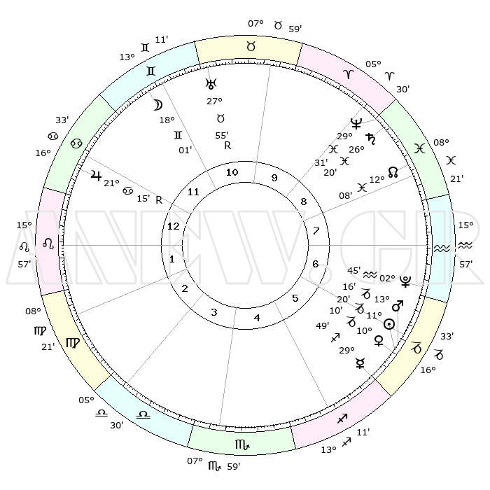 | | ΘΕΣΕΙΣ ΠΛΑΝΗΤΩΝ ΑΣΤΡΟΛΟΓΙΚΟΥ ΧΑΡΤΗ ΤΗΣ ΣΤΙΓΜΗΣ ΑΥΤΗΣ | | | | Πλανήτης | Ζώδιο | Μοίρες | Δεκαήμ. | Σε οίκο | Απόκλιση | | Ακμές των οίκων | | Ηλιος | Αιγόκερως | 11°15' | Δεύτερο | 6 | 22 S 57 | | 1ος | 23°16' | Καρκίνος | | Σελήνη | Δίδυμοι | 16°51' | Δεύτερο | 11 | 27 N 48 | | 2ος | 13°56' | Λέων | | Ερμής | Τοξότης | 29°42' | Τρίτο | 6 | 24 S 05 | | 3ος | 08°05' | Παρθένος | | Αφροδίτη | Αιγόκερως | 10°04' | Δεύτερο | 6 | 23 S 35 | | 4ος | 08°12' | Ζυγός | | Αρης | Αιγόκερως | 13°13' | Δεύτερο | 6 | 23 S 40 | | 5ος | 14°17' | Σκορπιός | | Δίας | Καρκίνος | 21°16'R | Τρίτο | 12 | 21 N 59 | | 6ος | 21°07' | Τοξότης | | Κρόνος | Ιχθείς | 26°20' | Τρίτο | 9 | 03 S 32 | | 7ος | 23°16' | Αιγόκερως | | Ουρανός | Ταύρος | 27°56'R | Τρίτο | 11 | 19 N 30 | | 8ος | 13°56' | Υδροχόος | | Ποσειδώνας | Ιχθείς | 29°31' | Τρίτο | 9 | 01 S 25 | | 9ος | 08°05' | Ιχθείς | | Πλούτωνας | Υδροχόος | 02°45' | Πρώτο | 7 | 23 S 13 | | 10ος | 08°12' | Κριός | | Β. Δεσμός | Ιχθείς | 12°08' | Δεύτερο | 9 | 07 S 00 | | 11ος | 14°17' | Ταύρος | | Ωροσκόπος | Καρκίνος | 23°16' | Τρίτο | | | 12ος | 21°07' | Δίδυμοι | | Μεσουράνημα | Κριός | 08°12' | Πρώτο | | | |