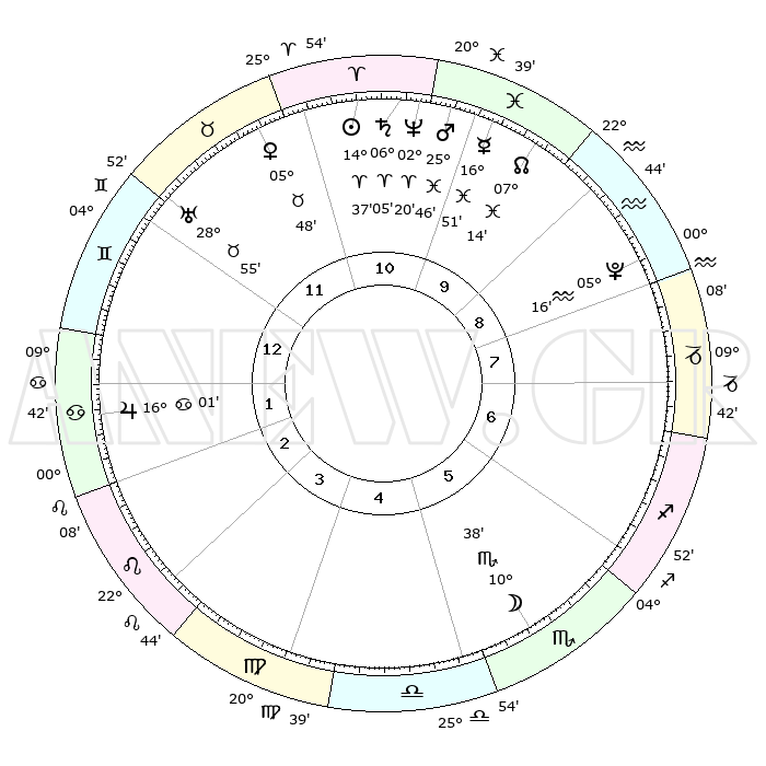 | | ΘΕΣΕΙΣ ΠΛΑΝΗΤΩΝ ΑΣΤΡΟΛΟΓΙΚΟΥ ΧΑΡΤΗ ΤΗΣ ΣΤΙΓΜΗΣ ΑΥΤΗΣ | | | | Πλανήτης | Ζώδιο | Μοίρες | Δεκαήμ. | Σε οίκο | Απόκλιση | | Ακμές των οίκων | | Ηλιος | Κριός | 14°33' | Δεύτερο | 11 | 05 N 44 | | 1ος | 16°35' | Δίδυμοι | | Σελήνη | Σκορπιός | 09°48' | Πρώτο | 6 | 19 S 03 | | 2ος | 08°38' | Καρκίνος | | Ερμής | Ιχθείς | 16°47' | Δεύτερο | 10 | 06 S 51 | | 3ος | 29°53' | Καρκίνος | | Αφροδίτη | Ταύρος | 05°43' | Πρώτο | 11 | 13 N 08 | | 4ος | 24°17' | Λέων | | Αρης | Ιχθείς | 25°43' | Τρίτο | 10 | 02 S 39 | | 5ος | 25°49' | Παρθένος | | Δίας | Καρκίνος | 16°01' | Δεύτερο | 2 | 22 N 51 | | 6ος | 06°01' | Σκορπιός | | Κρόνος | Κριός | 06°04' | Πρώτο | 11 | 00 N 27 | | 7ος | 16°35' | Τοξότης | | Ουρανός | Ταύρος | 28°55' | Τρίτο | 12 | 19 N 45 | | 8ος | 08°38' | Αιγόκερως | | Ποσειδώνας | Κριός | 02°20' | Πρώτο | 11 | 00 S 16 | | 9ος | 29°53' | Αιγόκερως | | Πλούτωνας | Υδροχόος | 05°16' | Πρώτο | 9 | 22 S 47 | | 10ος | 24°17' | Υδροχόος | | Β. Δεσμός | Ιχθείς | 07°14' | Πρώτο | 10 | 08 S 51 | | 11ος | 25°49' | Ιχθείς | | Ωροσκόπος | Δίδυμοι | 16°35' | Δεύτερο | | | 12ος | 06°01' | Ταύρος | | Μεσουράνημα | Υδροχόος | 24°17' | Τρίτο | | | |