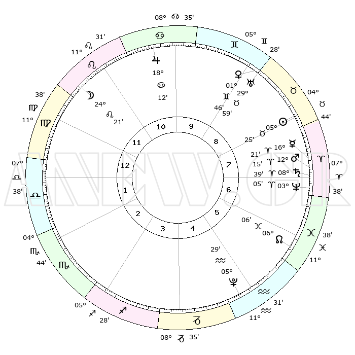 | | ΘΕΣΕΙΣ ΠΛΑΝΗΤΩΝ ΑΣΤΡΟΛΟΓΙΚΟΥ ΧΑΡΤΗ ΤΗΣ ΣΤΙΓΜΗΣ ΑΥΤΗΣ | | | | Πλανήτης | Ζώδιο | Μοίρες | Δεκαήμ. | Σε οίκο | Απόκλιση | | Ακμές των οίκων | | Ηλιος | Ταύρος | 05°21' | Πρώτο | 8 | 13 N 18 | | 1ος | 18°11' | Παρθένος | | Σελήνη | Λέων | 23°28' | Τρίτο | 12 | 14 N 51 | | 2ος | 13°49' | Ζυγός | | Ερμής | Κριός | 16°15' | Δεύτερο | 8 | 04 N 10 | | 3ος | 13°45' | Σκορπιός | | Αφροδίτη | Δίδυμοι | 01°41' | Πρώτο | 9 | 21 N 08 | | 4ος | 16°41' | Τοξότης | | Αρης | Κριός | 12°12' | Δεύτερο | 7 | 03 N 58 | | 5ος | 19°55' | Αιγόκερως | | Δίας | Καρκίνος | 18°11' | Δεύτερο | 10 | 22 N 35 | | 6ος | 20°49' | Υδροχόος | | Κρόνος | Κριός | 08°38' | Πρώτο | 7 | 01 N 26 | | 7ος | 18°11' | Ιχθείς | | Ουρανός | Ταύρος | 29°59' | Τρίτο | 9 | 19 N 59 | | 8ος | 13°49' | Κριός | | Ποσειδώνας | Κριός | 03°05' | Πρώτο | 7 | 00 N 01 | | 9ος | 13°45' | Ταύρος | | Πλούτωνας | Υδροχόος | 05°29' | Πρώτο | 5 | 22 S 48 | | 10ος | 16°41' | Δίδυμοι | | Β. Δεσμός | Ιχθείς | 06°06' | Πρώτο | 6 | 09 S 16 | | 11ος | 19°55' | Καρκίνος | | Ωροσκόπος | Παρθένος | 18°11' | Δεύτερο | | | 12ος | 20°49' | Λέων | | Μεσουράνημα | Δίδυμοι | 16°41' | Δεύτερο | | | |