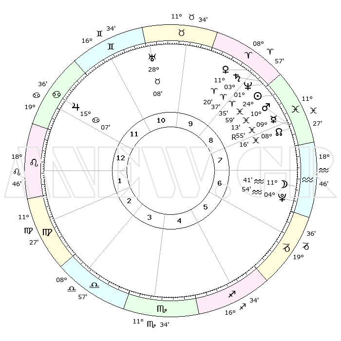 | | ΘΕΣΕΙΣ ΠΛΑΝΗΤΩΝ ΑΣΤΡΟΛΟΓΙΚΟΥ ΧΑΡΤΗ ΤΗΣ ΣΤΙΓΜΗΣ ΑΥΤΗΣ | | | | Πλανήτης | Ζώδιο | Μοίρες | Δεκαήμ. | Σε οίκο | Απόκλιση | | Ακμές των οίκων | | Ηλιος | Ιχθείς | 24°56' | Τρίτο | 9 | 02 S 01 | | 1ος | 04°41' | Λέων | | Σελήνη | Υδροχόος | 11°04' | Δεύτερο | 7 | 19 S 49 | | 2ος | 26°04' | Λέων | | Ερμής | Ιχθείς | 09°57'R | Πρώτο | 8 | 05 S 43 | | 3ος | 21°45' | Παρθένος | | Αφροδίτη | Κριός | 11°16' | Δεύτερο | 9 | 03 N 31 | | 4ος | 23°19' | Ζυγός | | Αρης | Ιχθείς | 10°11' | Δεύτερο | 8 | 08 S 45 | | 5ος | 29°12' | Σκορπιός | | Δίας | Καρκίνος | 15°07' | Δεύτερο | 12 | 22 N 56 | | 6ος | 04°09' | Αιγόκερως | | Κρόνος | Κριός | 03°36' | Πρώτο | 9 | 00 S 31 | | 7ος | 04°41' | Υδροχόος | | Ουρανός | Ταύρος | 28°08' | Τρίτο | 10 | 19 N 34 | | 8ος | 26°04' | Υδροχόος | | Ποσειδώνας | Κριός | 01°35' | Πρώτο | 9 | 00 S 34 | | 9ος | 21°45' | Ιχθείς | | Πλούτωνας | Υδροχόος | 04°54' | Πρώτο | 7 | 22 S 49 | | 10ος | 23°19' | Κριός | | Β. Δεσμός | Ιχθείς | 08°17' | Πρώτο | 8 | 08 S 28 | | 11ος | 29°12' | Ταύρος | | Ωροσκόπος | Λέων | 04°41' | Πρώτο | | | 12ος | 04°09' | Καρκίνος | | Μεσουράνημα | Κριός | 23°19' | Τρίτο | | | |