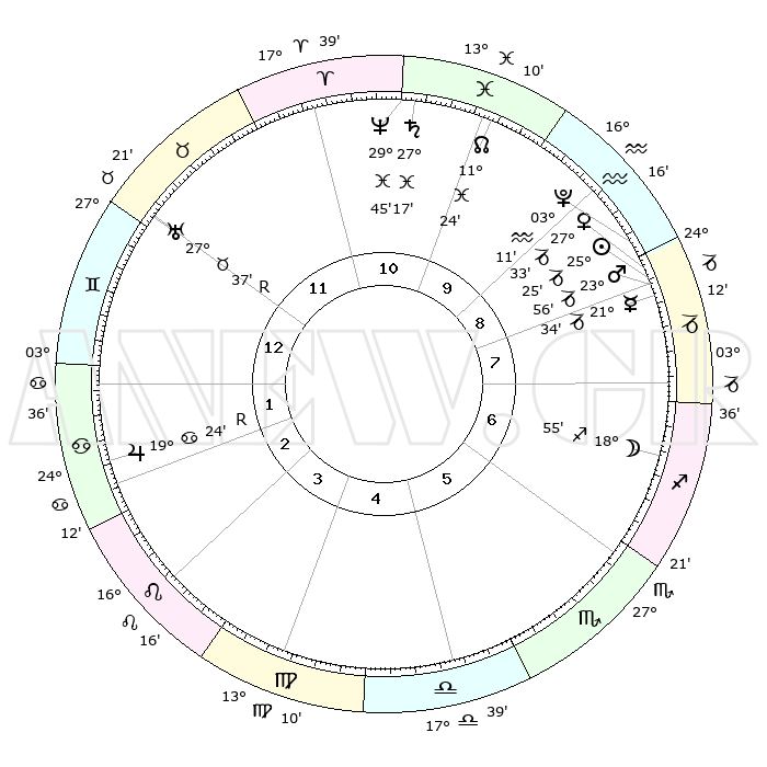 | | ΘΕΣΕΙΣ ΠΛΑΝΗΤΩΝ ΑΣΤΡΟΛΟΓΙΚΟΥ ΧΑΡΤΗ ΤΗΣ ΣΤΙΓΜΗΣ ΑΥΤΗΣ | | | | Πλανήτης | Ζώδιο | Μοίρες | Δεκαήμ. | Σε οίκο | Απόκλιση | | Ακμές των οίκων | | Ηλιος | Αιγόκερως | 24°34' | Τρίτο | 5 | 21 S 12 | | 1ος | 23°37' | Λέων | | Σελήνη | Τοξότης | 09°02' | Πρώτο | 4 | 26 S 51 | | 2ος | 16°48' | Παρθένος | | Ερμής | Αιγόκερως | 20°14' | Τρίτο | 5 | 23 S 40 | | 3ος | 14°50' | Ζυγός | | Αφροδίτη | Αιγόκερως | 26°30' | Τρίτο | 6 | 21 S 48 | | 4ος | 17°38' | Σκορπιός | | Αρης | Αιγόκερως | 23°17' | Τρίτο | 5 | 22 S 23 | | 5ος | 22°16' | Τοξότης | | Δίας | Καρκίνος | 19°31'R | Δεύτερο | 11 | 22 N 17 | | 6ος | 24°48' | Αιγόκερως | | Κρόνος | Ιχθείς | 27°14' | Τρίτο | 8 | 03 S 08 | | 7ος | 23°37' | Υδροχόος | | Ουρανός | Ταύρος | 27°38'R | Τρίτο | 10 | 19 N 26 | | 8ος | 16°48' | Ιχθείς | | Ποσειδώνας | Ιχθείς | 29°44' | Τρίτο | 8 | 01 S 19 | | 9ος | 14°50' | Κριός | | Πλούτωνας | Υδροχόος | 03°09' | Πρώτο | 6 | 23 S 08 | | 10ος | 17°38' | Ταύρος | | Β. Δεσμός | Ιχθείς | 11°26' | Δεύτερο | 7 | 07 S 16 | | 11ος | 22°17' | Δίδυμοι | | Ωροσκόπος | Λέων | 23°37' | Τρίτο | | | 12ος | 24°48' | Καρκίνος | | Μεσουράνημα | Ταύρος | 17°38' | Δεύτερο | | | |