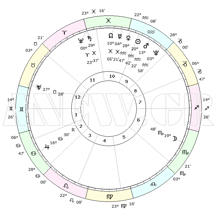 | | ΘΕΣΕΙΣ ΠΛΑΝΗΤΩΝ ΑΣΤΡΟΛΟΓΙΚΟΥ ΧΑΡΤΗ ΤΗΣ ΣΤΙΓΜΗΣ ΑΥΤΗΣ | | | | Πλανήτης | Ζώδιο | Μοίρες | Δεκαήμ. | Σε οίκο | Απόκλιση | | Ακμές των οίκων | | Ηλιος | Υδροχόος | 20°38' | Τρίτο | 10 | 14 S 37 | | 1ος | 16°15' | Ταύρος | | Σελήνη | Σκορπιός | 19°00' | Δεύτερο | 7 | 22 S 13 | | 2ος | 14°10' | Δίδυμοι | | Ερμής | Ιχθείς | 04°14' | Πρώτο | 11 | 10 S 53 | | 3ος | 06°19' | Καρκίνος | | Αφροδίτη | Υδροχόος | 28°42' | Τρίτο | 11 | 13 S 17 | | 4ος | 28°20' | Καρκίνος | | Αρης | Υδροχόος | 13°19' | Δεύτερο | 10 | 17 S 51 | | 5ος | 24°39' | Λέων | | Δίας | Καρκίνος | 16°30'R | Δεύτερο | 3 | 22 N 44 | | 6ος | 00°37' | Ζυγός | | Κρόνος | Ιχθείς | 29°37' | Τρίτο | 11 | 02 S 08 | | 7ος | 16°15' | Σκορπιός | | Ουρανός | Ταύρος | 27°28' | Τρίτο | 1 | 19 N 25 | | 8ος | 14°10' | Τοξότης | | Ποσειδώνας | Κριός | 00°23' | Πρώτο | 11 | 01 S 03 | | 9ος | 06°19' | Αιγόκερως | | Πλούτωνας | Υδροχόος | 03°58' | Πρώτο | 10 | 22 S 58 | | 10ος | 28°20' | Αιγόκερως | | Β. Δεσμός | Ιχθείς | 10°05' | Δεύτερο | 11 | 07 S 47 | | 11ος | 24°39' | Υδροχόος | | Ωροσκόπος | Ταύρος | 16°15' | Δεύτερο | | | 12ος | 00°37' | Κριός | | Μεσουράνημα | Αιγόκερως | 28°20' | Τρίτο | | | |
