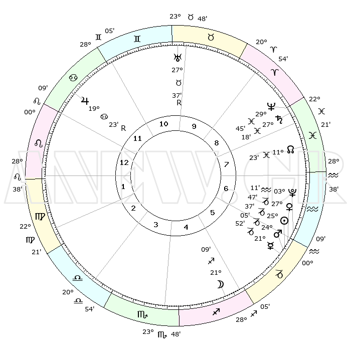 | | ΘΕΣΕΙΣ ΠΛΑΝΗΤΩΝ ΑΣΤΡΟΛΟΓΙΚΟΥ ΧΑΡΤΗ ΤΗΣ ΣΤΙΓΜΗΣ ΑΥΤΗΣ | | | | Πλανήτης | Ζώδιο | Μοίρες | Δεκαήμ. | Σε οίκο | Απόκλιση | | Ακμές των οίκων | | Ηλιος | Αιγόκερως | 25°32' | Τρίτο | 6 | 21 S 02 | | 1ος | 08°19' | Λέων | | Σελήνη | Τοξότης | 20°18' | Τρίτο | 5 | 28 S 06 | | 2ος | 29°60' | Λέων | | Ερμής | Αιγόκερως | 21°46' | Τρίτο | 6 | 23 S 29 | | 3ος | 26°10' | Παρθένος | | Αφροδίτη | Αιγόκερως | 27°42' | Τρίτο | 6 | 21 S 36 | | 4ος | 28°06' | Ζυγός | | Αρης | Αιγόκερως | 24°01' | Τρίτο | 6 | 22 S 15 | | 5ος | 03°48' | Τοξότης | | Δίας | Καρκίνος | 19°23'R | Δεύτερο | 12 | 22 N 18 | | 6ος | 08°12' | Αιγόκερως | | Κρόνος | Ιχθείς | 27°18' | Τρίτο | 9 | 03 S 06 | | 7ος | 08°19' | Υδροχόος | | Ουρανός | Ταύρος | 27°37'R | Τρίτο | 10 | 19 N 26 | | 8ος | 29°60' | Υδροχόος | | Ποσειδώνας | Ιχθείς | 29°45' | Τρίτο | 9 | 01 S 19 | | 9ος | 26°10' | Ιχθείς | | Πλούτωνας | Υδροχόος | 03°11' | Πρώτο | 6 | 23 S 07 | | 10ος | 28°06' | Κριός | | Β. Δεσμός | Ιχθείς | 11°23' | Δεύτερο | 8 | 07 S 17 | | 11ος | 03°48' | Δίδυμοι | | Ωροσκόπος | Λέων | 08°19' | Πρώτο | | | 12ος | 08°12' | Καρκίνος | | Μεσουράνημα | Κριός | 28°06' | Τρίτο | | | |
