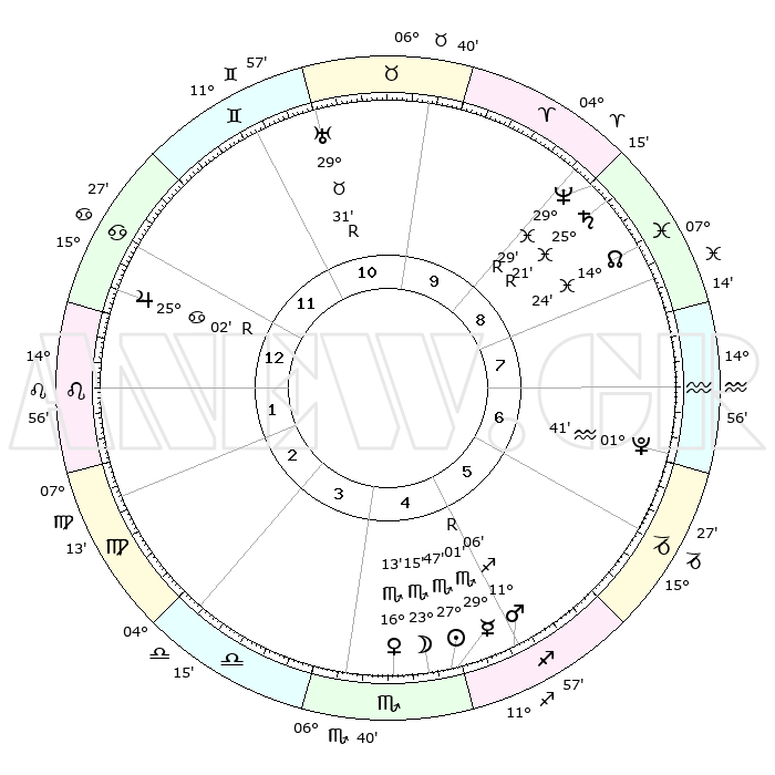 | | ΘΕΣΕΙΣ ΠΛΑΝΗΤΩΝ ΑΣΤΡΟΛΟΓΙΚΟΥ ΧΑΡΤΗ ΤΗΣ ΣΤΙΓΜΗΣ ΑΥΤΗΣ | | | | Πλανήτης | Ζώδιο | Μοίρες | Δεκαήμ. | Σε οίκο | Απόκλιση | | Ακμές των οίκων | | Ηλιος | Σκορπιός | 27°43' | Τρίτο | 5 | 19 S 39 | | 1ος | 28°23' | Καρκίνος | | Σελήνη | Σκορπιός | 22°34' | Τρίτο | 5 | 22 S 52 | | 2ος | 19°19' | Λέων | | Ερμής | Σκορπιός | 29°06'R | Τρίτο | 5 | 19 S 37 | | 3ος | 14°09' | Παρθένος | | Αφροδίτη | Σκορπιός | 16°09' | Δεύτερο | 4 | 15 S 38 | | 4ος | 14°58' | Ζυγός | | Αρης | Τοξότης | 11°04' | Δεύτερο | 5 | 22 S 39 | | 5ος | 21°03' | Σκορπιός | | Δίας | Καρκίνος | 25°02'R | Τρίτο | 12 | 21 N 15 | | 6ος | 27°01' | Τοξότης | | Κρόνος | Ιχθείς | 25°21'R | Τρίτο | 9 | 04 S 04 | | 7ος | 28°23' | Αιγόκερως | | Ουρανός | Ταύρος | 29°31'R | Τρίτο | 11 | 19 N 50 | | 8ος | 19°19' | Υδροχόος | | Ποσειδώνας | Ιχθείς | 29°29'R | Τρίτο | 9 | 01 S 27 | | 9ος | 14°09' | Ιχθείς | | Πλούτωνας | Υδροχόος | 01°41' | Πρώτο | 7 | 23 S 27 | | 10ος | 14°58' | Κριός | | Β. Δεσμός | Ιχθείς | 14°24' | Δεύτερο | 9 | 06 S 08 | | 11ος | 21°03' | Ταύρος | | Ωροσκόπος | Καρκίνος | 28°23' | Τρίτο | | | 12ος | 27°01' | Δίδυμοι | | Μεσουράνημα | Κριός | 14°58' | Δεύτερο | | | |