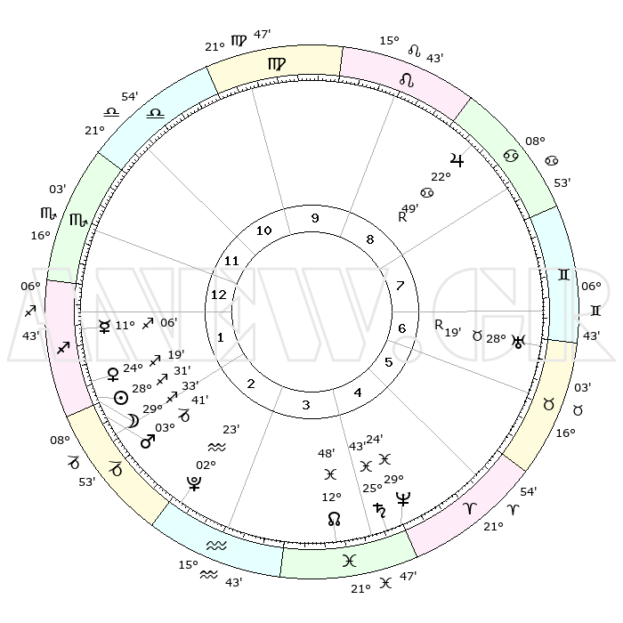 | | ΘΕΣΕΙΣ ΠΛΑΝΗΤΩΝ ΑΣΤΡΟΛΟΓΙΚΟΥ ΧΑΡΤΗ ΤΗΣ ΣΤΙΓΜΗΣ ΑΥΤΗΣ | | | | Πλανήτης | Ζώδιο | Μοίρες | Δεκαήμ. | Σε οίκο | Απόκλιση | | Ακμές των οίκων | | Ηλιος | Τοξότης | 28°27' | Τρίτο | 2 | 23 S 25 | | 1ος | 16°27' | Σκορπιός | | Σελήνη | Τοξότης | 28°42' | Τρίτο | 2 | 28 S 13 | | 2ος | 16°04' | Τοξότης | | Ερμής | Τοξότης | 10°60' | Δεύτερο | 1 | 21 S 13 | | 3ος | 19°44' | Αιγόκερως | | Αφροδίτη | Τοξότης | 24°14' | Τρίτο | 2 | 23 S 21 | | 4ος | 25°07' | Υδροχόος | | Αρης | Αιγόκερως | 03°38' | Πρώτο | 2 | 24 S 12 | | 5ος | 27°26' | Ιχθείς | | Δίας | Καρκίνος | 22°49'R | Τρίτο | 9 | 21 N 43 | | 6ος | 24°18' | Κριός | | Κρόνος | Ιχθείς | 25°42' | Τρίτο | 4 | 03 S 49 | | 7ος | 16°27' | Ταύρος | | Ουρανός | Ταύρος | 28°19'R | Τρίτο | 7 | 19 N 35 | | 8ος | 16°04' | Δίδυμοι | | Ποσειδώνας | Ιχθείς | 29°24' | Τρίτο | 5 | 01 S 28 | | 9ος | 19°44' | Καρκίνος | | Πλούτωνας | Υδροχόος | 02°23' | Πρώτο | 3 | 23 S 18 | | 10ος | 25°07' | Λέων | | Β. Δεσμός | Ιχθείς | 12°48' | Δεύτερο | 4 | 06 S 45 | | 11ος | 27°26' | Παρθένος | | Ωροσκόπος | Σκορπιός | 16°27' | Δεύτερο | | | 12ος | 24°18' | Ζυγός | | Μεσουράνημα | Λέων | 25°07' | Τρίτο | | | |