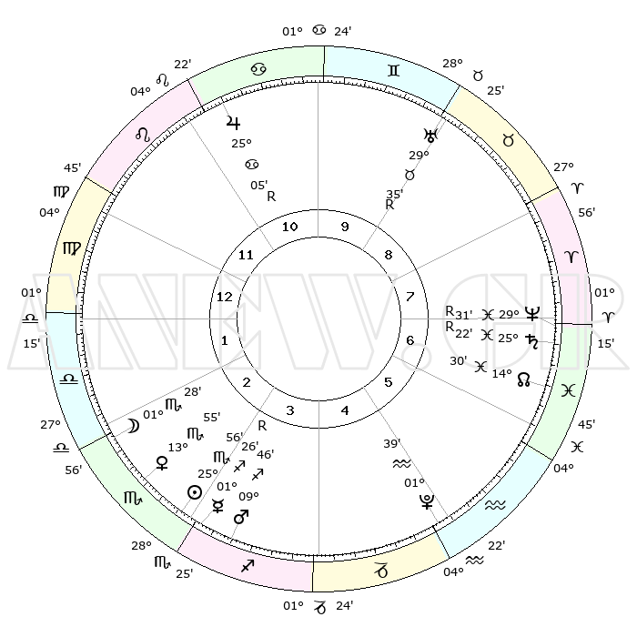 | | ΘΕΣΕΙΣ ΠΛΑΝΗΤΩΝ ΑΣΤΡΟΛΟΓΙΚΟΥ ΧΑΡΤΗ ΤΗΣ ΣΤΙΓΜΗΣ ΑΥΤΗΣ | | | | Πλανήτης | Ζώδιο | Μοίρες | Δεκαήμ. | Σε οίκο | Απόκλιση | | Ακμές των οίκων | | Ηλιος | Σκορπιός | 25°52' | Τρίτο | 3 | 19 S 13 | | 1ος | 15°05' | Παρθένος | | Σελήνη | Σκορπιός | 00°49' | Πρώτο | 2 | 15 S 05 | | 2ος | 10°27' | Ζυγός | | Ερμής | Τοξότης | 01°30'R | Πρώτο | 3 | 20 S 44 | | 3ος | 10°12' | Σκορπιός | | Αφροδίτη | Σκορπιός | 13°51' | Δεύτερο | 3 | 14 S 55 | | 4ος | 13°09' | Τοξότης | | Αρης | Τοξότης | 09°43' | Πρώτο | 3 | 22 S 27 | | 5ος | 16°30' | Αιγόκερως | | Δίας | Καρκίνος | 25°05'R | Τρίτο | 11 | 21 N 14 | | 6ος | 17°32' | Υδροχόος | | Κρόνος | Ιχθείς | 25°23'R | Τρίτο | 7 | 04 S 03 | | 7ος | 15°05' | Ιχθείς | | Ουρανός | Ταύρος | 29°35'R | Τρίτο | 9 | 19 N 51 | | 8ος | 10°27' | Κριός | | Ποσειδώνας | Ιχθείς | 29°31'R | Τρίτο | 7 | 01 S 27 | | 9ος | 10°12' | Ταύρος | | Πλούτωνας | Υδροχόος | 01°39' | Πρώτο | 5 | 23 S 28 | | 10ος | 13°09' | Δίδυμοι | | Β. Δεσμός | Ιχθείς | 14°30' | Δεύτερο | 6 | 06 S 06 | | 11ος | 16°30' | Καρκίνος | | Ωροσκόπος | Παρθένος | 15°05' | Δεύτερο | | | 12ος | 17°32' | Λέων | | Μεσουράνημα | Δίδυμοι | 13°09' | Δεύτερο | | | |