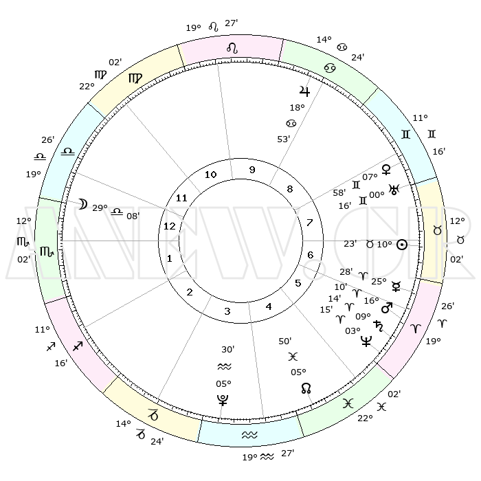 | | ΘΕΣΕΙΣ ΠΛΑΝΗΤΩΝ ΑΣΤΡΟΛΟΓΙΚΟΥ ΧΑΡΤΗ ΤΗΣ ΣΤΙΓΜΗΣ ΑΥΤΗΣ | | | | Πλανήτης | Ζώδιο | Μοίρες | Δεκαήμ. | Σε οίκο | Απόκλιση | | Ακμές των οίκων | | Ηλιος | Ταύρος | 10°20' | Δεύτερο | 7 | 14 N 55 | | 1ος | 27°07' | Ζυγός | | Σελήνη | Ζυγός | 28°30' | Τρίτο | 1 | 14 S 38 | | 2ος | 25°22' | Σκορπιός | | Ερμής | Κριός | 25°22' | Τρίτο | 6 | 07 N 59 | | 3ος | 27°06' | Τοξότης | | Αφροδίτη | Δίδυμοι | 07°54' | Πρώτο | 8 | 22 N 30 | | 4ος | 01°06' | Υδροχόος | | Αρης | Κριός | 16°08' | Δεύτερο | 6 | 05 N 31 | | 5ος | 04°02' | Ιχθείς | | Δίας | Καρκίνος | 18°52' | Δεύτερο | 9 | 22 N 29 | | 6ος | 02°58' | Κριός | | Κρόνος | Κριός | 09°13' | Πρώτο | 6 | 01 N 39 | | 7ος | 27°07' | Κριός | | Ουρανός | Δίδυμοι | 00°16' | Πρώτο | 8 | 20 N 02 | | 8ος | 25°22' | Ταύρος | | Ποσειδώνας | Κριός | 03°15' | Πρώτο | 6 | 00 N 05 | | 9ος | 27°06' | Δίδυμοι | | Πλούτωνας | Υδροχόος | 05°30' | Πρώτο | 4 | 22 S 49 | | 10ος | 01°06' | Λέων | | Β. Δεσμός | Ιχθείς | 05°50' | Πρώτο | 5 | 09 S 22 | | 11ος | 04°02' | Παρθένος | | Ωροσκόπος | Ζυγός | 27°07' | Τρίτο | | | 12ος | 02°58' | Ζυγός | | Μεσουράνημα | Λέων | 01°06' | Πρώτο | | | |