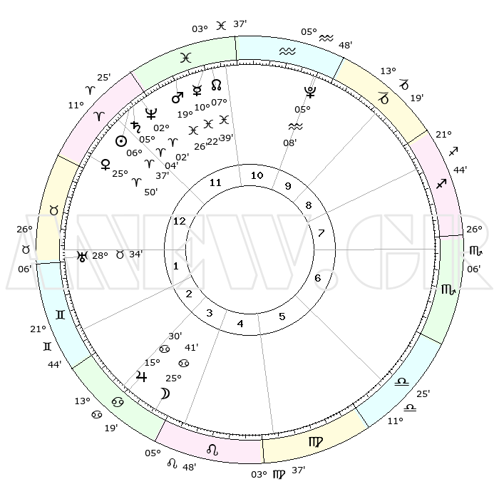 | | ΘΕΣΕΙΣ ΠΛΑΝΗΤΩΝ ΑΣΤΡΟΛΟΓΙΚΟΥ ΧΑΡΤΗ ΤΗΣ ΣΤΙΓΜΗΣ ΑΥΤΗΣ | | | | Πλανήτης | Ζώδιο | Μοίρες | Δεκαήμ. | Σε οίκο | Απόκλιση | | Ακμές των οίκων | | Ηλιος | Κριός | 06°33' | Πρώτο | 12 | 02 N 36 | | 1ος | 28°25' | Κριός | | Σελήνη | Καρκίνος | 24°54' | Τρίτο | 4 | 24 N 42 | | 2ος | 01°04' | Δίδυμοι | | Ερμής | Ιχθείς | 10°20' | Δεύτερο | 11 | 08 S 06 | | 3ος | 24°48' | Δίδυμοι | | Αφροδίτη | Κριός | 25°46' | Τρίτο | 12 | 09 N 22 | | 4ος | 16°29' | Καρκίνος | | Αρης | Ιχθείς | 19°23' | Δεύτερο | 12 | 05 S 11 | | 5ος | 10°43' | Λέων | | Δίας | Καρκίνος | 15°30' | Δεύτερο | 3 | 22 N 54 | | 6ος | 13°08' | Παρθένος | | Κρόνος | Κριός | 05°04' | Πρώτο | 12 | 00 N 04 | | 7ος | 28°25' | Ζυγός | | Ουρανός | Ταύρος | 28°34' | Τρίτο | 1 | 19 N 40 | | 8ος | 01°04' | Τοξότης | | Ποσειδώνας | Κριός | 02°02' | Πρώτο | 12 | 00 S 24 | | 9ος | 24°48' | Τοξότης | | Πλούτωνας | Υδροχόος | 05°08' | Πρώτο | 10 | 22 S 48 | | 10ος | 16°29' | Αιγόκερως | | Β. Δεσμός | Ιχθείς | 07°39' | Πρώτο | 11 | 08 S 42 | | 11ος | 10°44' | Υδροχόος | | Ωροσκόπος | Κριός | 28°25' | Τρίτο | | | 12ος | 13°08' | Ιχθείς | | Μεσουράνημα | Αιγόκερως | 16°29' | Δεύτερο | | | |