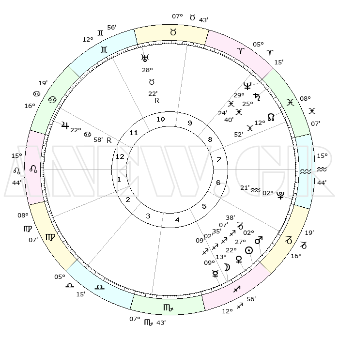 | | ΘΕΣΕΙΣ ΠΛΑΝΗΤΩΝ ΑΣΤΡΟΛΟΓΙΚΟΥ ΧΑΡΤΗ ΤΗΣ ΣΤΙΓΜΗΣ ΑΥΤΗΣ | | | | Πλανήτης | Ζώδιο | Μοίρες | Δεκαήμ. | Σε οίκο | Απόκλιση | | Ακμές των οίκων | | Ηλιος | Τοξότης | 26°39' | Τρίτο | 11 | 23 S 23 | | 1ος | 00°58' | Υδροχόος | | Σελήνη | Τοξότης | 07°33' | Πρώτο | 10 | 26 S 29 | | 2ος | 15°14' | Ιχθείς | | Ερμής | Τοξότης | 08°30' | Πρώτο | 10 | 20 S 37 | | 3ος | 23°31' | Κριός | | Αφροδίτη | Τοξότης | 22°01' | Τρίτο | 11 | 23 S 10 | | 4ος | 21°49' | Ταύρος | | Αρης | Αιγόκερως | 02°17' | Πρώτο | 11 | 24 S 13 | | 5ος | 14°30' | Δίδυμοι | | Δίας | Καρκίνος | 23°01'R | Τρίτο | 6 | 21 N 40 | | 6ος | 05°58' | Καρκίνος | | Κρόνος | Ιχθείς | 25°39' | Τρίτο | 2 | 03 S 51 | | 7ος | 00°58' | Λέων | | Ουρανός | Ταύρος | 28°23'R | Τρίτο | 4 | 19 N 36 | | 8ος | 15°14' | Παρθένος | | Ποσειδώνας | Ιχθείς | 29°23' | Τρίτο | 2 | 01 S 28 | | 9ος | 23°31' | Ζυγός | | Πλούτωνας | Υδροχόος | 02°20' | Πρώτο | 1 | 23 S 18 | | 10ος | 21°49' | Σκορπιός | | Β. Δεσμός | Ιχθείς | 12°54' | Δεύτερο | 1 | 06 S 43 | | 11ος | 14°30' | Τοξότης | | Ωροσκόπος | Υδροχόος | 00°58' | Πρώτο | | | 12ος | 05°58' | Αιγόκερως | | Μεσουράνημα | Σκορπιός | 21°49' | Τρίτο | | | |