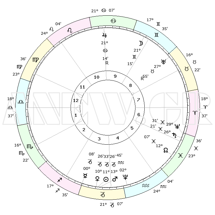 | | ΘΕΣΕΙΣ ΠΛΑΝΗΤΩΝ ΑΣΤΡΟΛΟΓΙΚΟΥ ΧΑΡΤΗ ΤΗΣ ΣΤΙΓΜΗΣ ΑΥΤΗΣ | | | | Πλανήτης | Ζώδιο | Μοίρες | Δεκαήμ. | Σε οίκο | Απόκλιση | | Ακμές των οίκων | | Ηλιος | Αιγόκερως | 11°29' | Δεύτερο | 4 | 22 S 56 | | 1ος | 27°58' | Παρθένος | | Σελήνη | Δίδυμοι | 20°11' | Τρίτο | 9 | 28 N 03 | | 2ος | 24°24' | Ζυγός | | Ερμής | Αιγόκερως | 00°02' | Πρώτο | 4 | 24 S 06 | | 3ος | 24°45' | Σκορπιός | | Αφροδίτη | Αιγόκερως | 10°21' | Δεύτερο | 4 | 23 S 34 | | 4ος | 27°43' | Τοξότης | | Αρης | Αιγόκερως | 13°23' | Δεύτερο | 4 | 23 S 39 | | 5ος | 00°43' | Υδροχόος | | Δίας | Καρκίνος | 21°14'R | Τρίτο | 10 | 22 N 00 | | 6ος | 01°14' | Ιχθείς | | Κρόνος | Ιχθείς | 26°20' | Τρίτο | 6 | 03 S 32 | | 7ος | 27°58' | Ιχθείς | | Ουρανός | Ταύρος | 27°55'R | Τρίτο | 9 | 19 N 30 | | 8ος | 24°24' | Κριός | | Ποσειδώνας | Ιχθείς | 29°31' | Τρίτο | 7 | 01 S 25 | | 9ος | 24°45' | Ταύρος | | Πλούτωνας | Υδροχόος | 02°45' | Πρώτο | 5 | 23 S 13 | | 10ος | 27°43' | Δίδυμοι | | Β. Δεσμός | Ιχθείς | 12°07' | Δεύτερο | 6 | 07 S 01 | | 11ος | 00°43' | Λέων | | Ωροσκόπος | Παρθένος | 27°58' | Τρίτο | | | 12ος | 01°14' | Παρθένος | | Μεσουράνημα | Δίδυμοι | 27°43' | Τρίτο | | | |