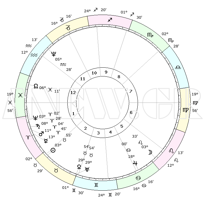 | | ΘΕΣΕΙΣ ΠΛΑΝΗΤΩΝ ΑΣΤΡΟΛΟΓΙΚΟΥ ΧΑΡΤΗ ΤΗΣ ΣΤΙΓΜΗΣ ΑΥΤΗΣ | | | | Πλανήτης | Ζώδιο | Μοίρες | Δεκαήμ. | Σε οίκο | Απόκλιση | | Ακμές των οίκων | | Ηλιος | Ταύρος | 03°52' | Πρώτο | 2 | 12 N 48 | | 1ος | 17°03' | Υδροχόος | | Σελήνη | Λέων | 02°44' | Πρώτο | 6 | 22 N 22 | | 2ος | 02°50' | Κριός | | Ερμής | Κριός | 13°39' | Δεύτερο | 2 | 03 N 06 | | 3ος | 08°08' | Ταύρος | | Αφροδίτη | Ταύρος | 29°50' | Τρίτο | 3 | 20 N 41 | | 4ος | 04°01' | Δίδυμοι | | Αρης | Κριός | 11°01' | Δεύτερο | 2 | 03 N 30 | | 5ος | 25°55' | Δίδυμοι | | Δίας | Καρκίνος | 17°60' | Δεύτερο | 5 | 22 N 36 | | 6ος | 18°18' | Καρκίνος | | Κρόνος | Κριός | 08°27' | Πρώτο | 2 | 01 N 22 | | 7ος | 17°03' | Λέων | | Ουρανός | Ταύρος | 29°54' | Τρίτο | 3 | 19 N 58 | | 8ος | 02°50' | Ζυγός | | Ποσειδώνας | Κριός | 03°02' | Πρώτο | 2 | 00 S 00 | | 9ος | 08°08' | Σκορπιός | | Πλούτωνας | Υδροχόος | 05°28' | Πρώτο | 12 | 22 S 48 | | 10ος | 04°01' | Τοξότης | | Β. Δεσμός | Ιχθείς | 06°11' | Πρώτο | 1 | 09 S 14 | | 11ος | 25°55' | Τοξότης | | Ωροσκόπος | Υδροχόος | 17°03' | Δεύτερο | | | 12ος | 18°18' | Αιγόκερως | | Μεσουράνημα | Τοξότης | 04°01' | Πρώτο | | | |