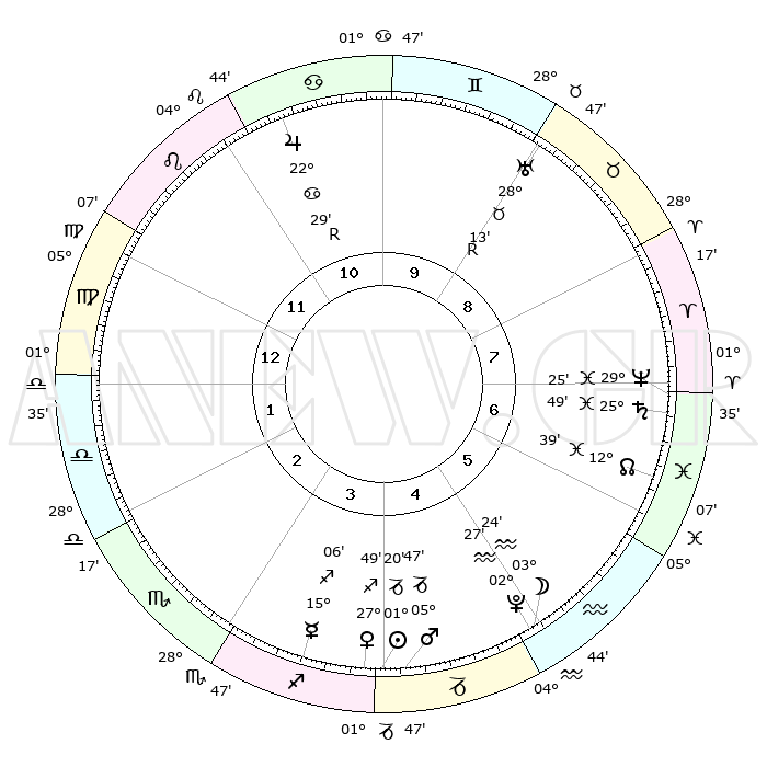 | | ΘΕΣΕΙΣ ΠΛΑΝΗΤΩΝ ΑΣΤΡΟΛΟΓΙΚΟΥ ΧΑΡΤΗ ΤΗΣ ΣΤΙΓΜΗΣ ΑΥΤΗΣ | | | | Πλανήτης | Ζώδιο | Μοίρες | Δεκαήμ. | Σε οίκο | Απόκλιση | | Ακμές των οίκων | | Ηλιος | Αιγόκερως | 01°14' | Πρώτο | 4 | 23 S 26 | | 1ος | 03°49' | Παρθένος | | Σελήνη | Υδροχόος | 02°13' | Πρώτο | 5 | 22 S 46 | | 2ος | 28°05' | Παρθένος | | Ερμής | Τοξότης | 14°58' | Δεύτερο | 4 | 22 S 03 | | 3ος | 27°05' | Ζυγός | | Αφροδίτη | Τοξότης | 27°41' | Τρίτο | 4 | 23 S 34 | | 4ος | 00°01' | Τοξότης | | Αρης | Αιγόκερως | 05°42' | Πρώτο | 5 | 24 S 08 | | 5ος | 03°58' | Αιγόκερως | | Δίας | Καρκίνος | 22°30'R | Τρίτο | 11 | 21 N 46 | | 6ος | 05°38' | Υδροχόος | | Κρόνος | Ιχθείς | 25°49' | Τρίτο | 7 | 03 S 46 | | 7ος | 03°49' | Ιχθείς | | Ουρανός | Ταύρος | 28°13'R | Τρίτο | 9 | 19 N 34 | | 8ος | 28°05' | Ιχθείς | | Ποσειδώνας | Ιχθείς | 29°25' | Τρίτο | 8 | 01 S 28 | | 9ος | 27°05' | Κριός | | Πλούτωνας | Υδροχόος | 02°27' | Πρώτο | 5 | 23 S 17 | | 10ος | 00°01' | Δίδυμοι | | Β. Δεσμός | Ιχθείς | 12°39' | Δεύτερο | 7 | 06 S 49 | | 11ος | 03°58' | Καρκίνος | | Ωροσκόπος | Παρθένος | 03°49' | Πρώτο | | | 12ος | 05°38' | Λέων | | Μεσουράνημα | Δίδυμοι | 00°01' | Πρώτο | | | |