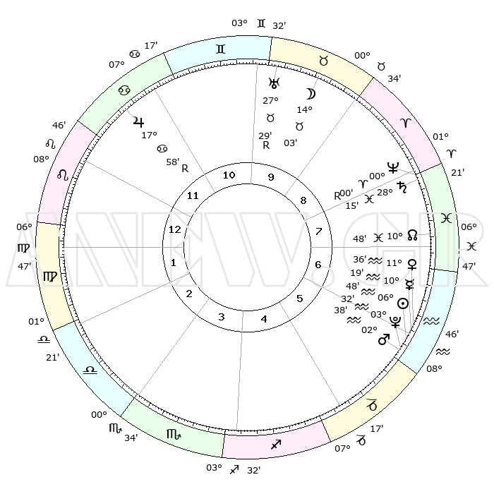 | | ΘΕΣΕΙΣ ΠΛΑΝΗΤΩΝ ΑΣΤΡΟΛΟΓΙΚΟΥ ΧΑΡΤΗ ΤΗΣ ΣΤΙΓΜΗΣ ΑΥΤΗΣ | | | | Πλανήτης | Ζώδιο | Μοίρες | Δεκαήμ. | Σε οίκο | Απόκλιση | | Ακμές των οίκων | | Ηλιος | Υδροχόος | 06°43' | Πρώτο | 6 | 18 S 35 | | 1ος | 14°12' | Λέων | | Σελήνη | Ταύρος | 12°57' | Δεύτερο | 10 | 20 N 10 | | 2ος | 06°25' | Παρθένος | | Ερμής | Υδροχόος | 10°11' | Δεύτερο | 6 | 19 S 41 | | 3ος | 03°22' | Ζυγός | | Αφροδίτη | Υδροχόος | 11°30' | Δεύτερο | 6 | 18 S 33 | | 4ος | 05°44' | Σκορπιός | | Αρης | Υδροχόος | 02°35' | Πρώτο | 6 | 20 S 35 | | 5ος | 11°04' | Τοξότης | | Δίας | Καρκίνος | 17°59'R | Δεύτερο | 12 | 22 N 31 | | 6ος | 14°39' | Αιγόκερως | | Κρόνος | Ιχθείς | 28°15' | Τρίτο | 8 | 02 S 42 | | 7ος | 14°12' | Υδροχόος | | Ουρανός | Ταύρος | 27°29'R | Τρίτο | 10 | 19 N 24 | | 8ος | 06°25' | Ιχθείς | | Ποσειδώνας | Κριός | 00°00'R | Πρώτο | 8 | 01 S 12 | | 9ος | 03°22' | Κριός | | Πλούτωνας | Υδροχόος | 03°32' | Πρώτο | 6 | 23 S 03 | | 10ος | 05°44' | Ταύρος | | Β. Δεσμός | Ιχθείς | 10°49' | Δεύτερο | 8 | 07 S 31 | | 11ος | 11°04' | Δίδυμοι | | Ωροσκόπος | Λέων | 14°12' | Δεύτερο | | | 12ος | 14°39' | Καρκίνος | | Μεσουράνημα | Ταύρος | 05°44' | Πρώτο | | | |