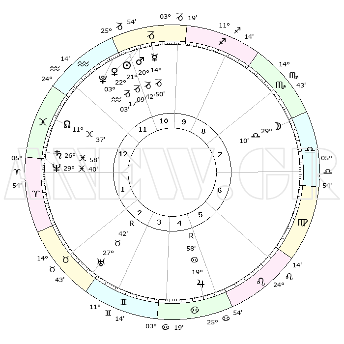 | | ΘΕΣΕΙΣ ΠΛΑΝΗΤΩΝ ΑΣΤΡΟΛΟΓΙΚΟΥ ΧΑΡΤΗ ΤΗΣ ΣΤΙΓΜΗΣ ΑΥΤΗΣ | | | | Πλανήτης | Ζώδιο | Μοίρες | Δεκαήμ. | Σε οίκο | Απόκλιση | | Ακμές των οίκων | | Ηλιος | Αιγόκερως | 20°46' | Τρίτο | 3 | 21 S 50 | | 1ος | 05°42' | Σκορπιός | | Σελήνη | Ζυγός | 24°32' | Τρίτο | 12 | 12 S 50 | | 2ος | 04°28' | Τοξότης | | Ερμής | Αιγόκερως | 14°13' | Δεύτερο | 3 | 24 S 11 | | 3ος | 06°56' | Αιγόκερως | | Αφροδίτη | Αιγόκερως | 21°48' | Τρίτο | 3 | 22 S 31 | | 4ος | 11°31' | Υδροχόος | | Αρης | Αιγόκερως | 20°24' | Τρίτο | 3 | 22 S 49 | | 5ος | 14°20' | Ιχθείς | | Δίας | Καρκίνος | 20°01'R | Τρίτο | 9 | 22 N 12 | | 6ος | 12°27' | Κριός | | Κρόνος | Ιχθείς | 26°57' | Τρίτο | 5 | 03 S 16 | | 7ος | 05°42' | Ταύρος | | Ουρανός | Ταύρος | 27°42'R | Τρίτο | 7 | 19 N 27 | | 8ος | 04°28' | Δίδυμοι | | Ποσειδώνας | Ιχθείς | 29°40' | Τρίτο | 5 | 01 S 21 | | 9ος | 06°55' | Καρκίνος | | Πλούτωνας | Υδροχόος | 03°02' | Πρώτο | 3 | 23 S 09 | | 10ος | 11°31' | Λέων | | Β. Δεσμός | Ιχθείς | 11°38' | Δεύτερο | 4 | 07 S 12 | | 11ος | 14°20' | Παρθένος | | Ωροσκόπος | Σκορπιός | 05°42' | Πρώτο | | | 12ος | 12°27' | Ζυγός | | Μεσουράνημα | Λέων | 11°31' | Δεύτερο | | | |