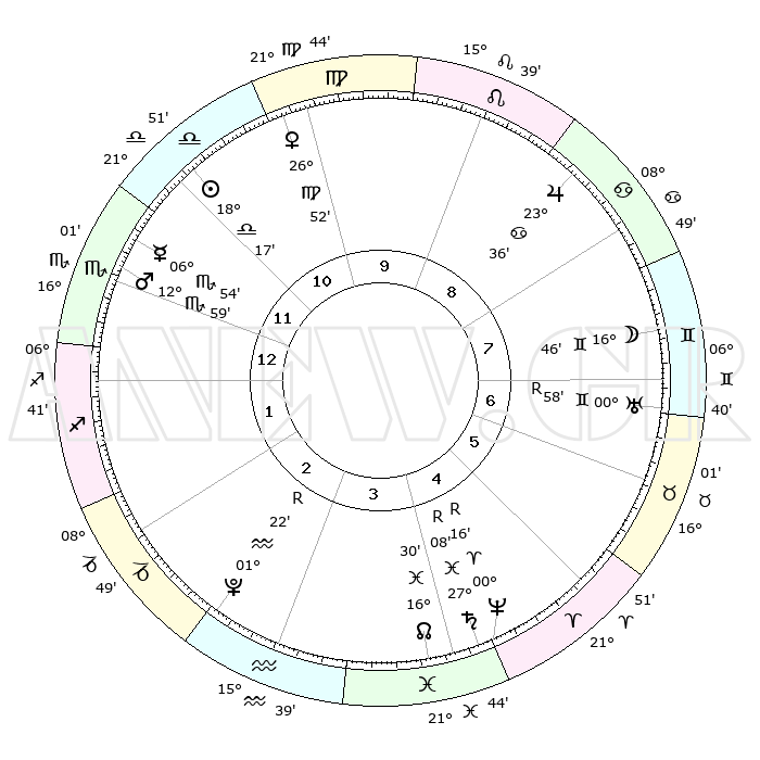 | ΘΕΣΕΙΣ ΠΛΑΝΗΤΩΝ ΑΣΤΡΟΛΟΓΙΚΟΥ ΧΑΡΤΗ ΤΗΣ ΣΤΙΓΜΗΣ ΑΥΤΗΣ | | Πλανήτης | Ζώδιο | Μοίρες | Δεκαήμ. | Σε οίκο | Απόκλιση | | Ακμές των οίκων | Ηλιος | Ζυγός | 18°06' | Δεύτερο | 1 | 07 S 06 | | 1ος | 13°27' | Ζυγός | Σελήνη | Δίδυμοι | 14°06' | Δεύτερο | 9 | 27 N 39 | | 2ος | 10°54' | Σκορπιός | Ερμής | Σκορπιός | 06°38' | Πρώτο | 1 | 14 S 58 | | 3ος | 11°53' | Τοξότης | Αφροδίτη | Παρθένος | 26°39' | Τρίτο | 12 | 02 N 41 | | 4ος | 15°11' | Αιγόκερως | Αρης | Σκορπιός | 12°51' | Δεύτερο | 2 | 15 S 52 | | 5ος | 18°07' | Υδροχόος | Δίας | Καρκίνος | 23°35' | Τρίτο | 10 | 21 N 25 | | 6ος | 17°57' | Ιχθείς | Κρόνος | Ιχθείς | 27°09'R | Τρίτο | 6 | 03 S 26 | | 7ος | 13°27' | Κριός | Ουρανός | Δίδυμοι | 00°58'R | Πρώτο | 8 | 20 N 08 | | 8ος | 10°54' | Ταύρος | Ποσειδώνας | Κριός | 00°16'R | Πρώτο | 6 | 01 S 09 | | 9ος | 11°53' | Δίδυμοι | Πλούτωνας | Υδροχόος | 01°22'R | Πρώτο | 4 | 23 S 32 | | 10ος | 15°11' | Καρκίνος | Β. Δεσμός | Ιχθείς | 16°30' | Δεύτερο | 5 | 05 S 20 | | 11ος | 18°07' | Λέων | Ωροσκόπος | Ζυγός | 13°27' | Δεύτερο | | | 12ος | 17°57' | Παρθένος | Μεσουράνημα | Καρκίνος | 15°11' | Δεύτερο | | | |