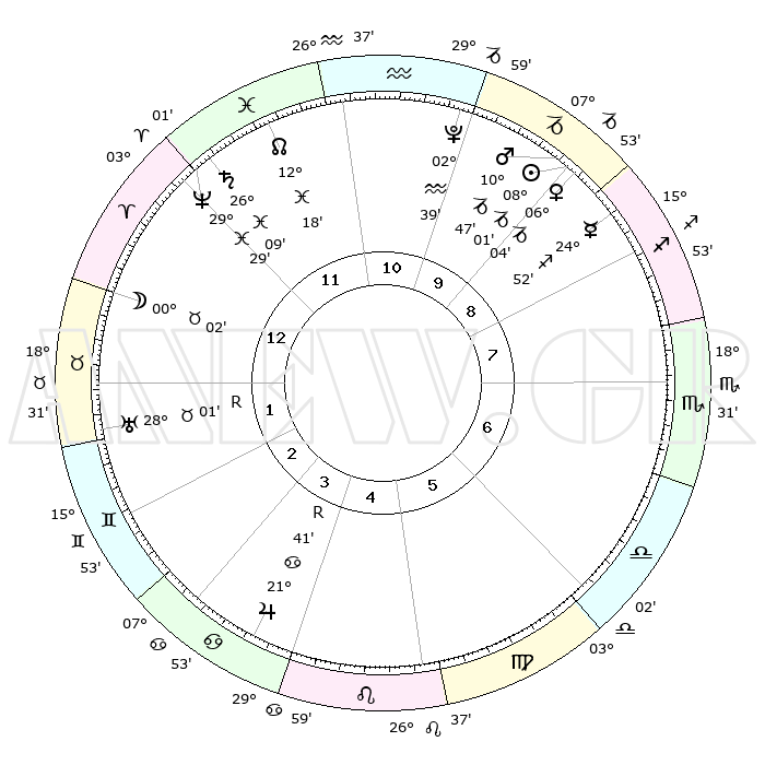 | | ΘΕΣΕΙΣ ΠΛΑΝΗΤΩΝ ΑΣΤΡΟΛΟΓΙΚΟΥ ΧΑΡΤΗ ΤΗΣ ΣΤΙΓΜΗΣ ΑΥΤΗΣ | | | | Πλανήτης | Ζώδιο | Μοίρες | Δεκαήμ. | Σε οίκο | Απόκλιση | | Ακμές των οίκων | | Ηλιος | Αιγόκερως | 07°57' | Πρώτο | 10 | 23 S 12 | | 1ος | 07°53' | Κριός | | Σελήνη | Κριός | 28°57' | Τρίτο | 1 | 14 N 37 | | 2ος | 16°11' | Ταύρος | | Ερμής | Τοξότης | 24°45' | Τρίτο | 9 | 23 S 36 | | 3ος | 12°26' | Δίδυμοι | | Αφροδίτη | Αιγόκερως | 05°59' | Πρώτο | 10 | 23 S 42 | | 4ος | 04°26' | Καρκίνος | | Αρης | Αιγόκερως | 10°44' | Δεύτερο | 10 | 23 S 52 | | 5ος | 27°08' | Καρκίνος | | Δίας | Καρκίνος | 21°41'R | Τρίτο | 4 | 21 N 55 | | 6ος | 25°48' | Λέων | | Κρόνος | Ιχθείς | 26°09' | Τρίτο | 12 | 03 S 37 | | 7ος | 07°53' | Ζυγός | | Ουρανός | Ταύρος | 28°01'R | Τρίτο | 2 | 19 N 31 | | 8ος | 16°11' | Σκορπιός | | Ποσειδώνας | Ιχθείς | 29°29' | Τρίτο | 12 | 01 S 26 | | 9ος | 12°26' | Τοξότης | | Πλούτωνας | Υδροχόος | 02°39' | Πρώτο | 11 | 23 S 14 | | 10ος | 04°26' | Αιγόκερως | | Β. Δεσμός | Ιχθείς | 12°18' | Δεύτερο | 12 | 06 S 57 | | 11ος | 27°08' | Αιγόκερως | | Ωροσκόπος | Κριός | 07°53' | Πρώτο | | | 12ος | 25°48' | Υδροχόος | | Μεσουράνημα | Αιγόκερως | 04°26' | Πρώτο | | | |
