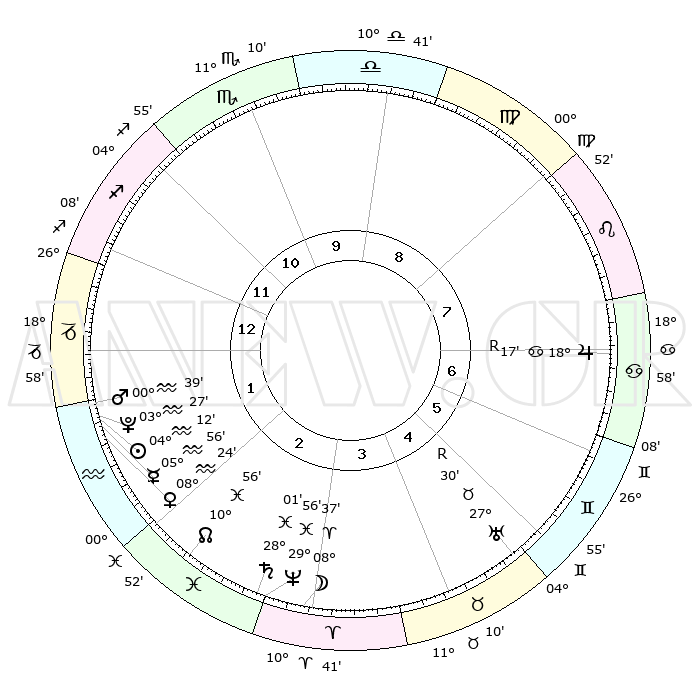 | | ΘΕΣΕΙΣ ΠΛΑΝΗΤΩΝ ΑΣΤΡΟΛΟΓΙΚΟΥ ΧΑΡΤΗ ΤΗΣ ΣΤΙΓΜΗΣ ΑΥΤΗΣ | | | | Πλανήτης | Ζώδιο | Μοίρες | Δεκαήμ. | Σε οίκο | Απόκλιση | | Ακμές των οίκων | | Ηλιος | Υδροχόος | 04°02' | Πρώτο | 2 | 19 S 14 | | 1ος | 27°52' | Σκορπιός | | Σελήνη | Κριός | 06°29' | Πρώτο | 4 | 04 N 45 | | 2ος | 28°43' | Τοξότης | | Ερμής | Υδροχόος | 05°39' | Πρώτο | 3 | 20 S 52 | | 3ος | 04°04' | Υδροχόος | | Αφροδίτη | Υδροχόος | 08°12' | Πρώτο | 3 | 19 S 23 | | 4ος | 10°03' | Ιχθείς | | Αρης | Υδροχόος | 00°31' | Πρώτο | 2 | 21 S 01 | | 5ος | 11°21' | Κριός | | Δίας | Καρκίνος | 18°18'R | Δεύτερο | 8 | 22 N 28 | | 6ος | 06°41' | Ταύρος | | Κρόνος | Ιχθείς | 28°00' | Τρίτο | 4 | 02 S 48 | | 7ος | 27°52' | Ταύρος | | Ουρανός | Ταύρος | 27°31'R | Τρίτο | 6 | 19 N 25 | | 8ος | 28°43' | Δίδυμοι | | Ποσειδώνας | Ιχθείς | 29°56' | Τρίτο | 4 | 01 S 14 | | 9ος | 04°04' | Λέων | | Πλούτωνας | Υδροχόος | 03°27' | Πρώτο | 2 | 23 S 04 | | 10ος | 10°03' | Παρθένος | | Β. Δεσμός | Ιχθείς | 10°57' | Δεύτερο | 4 | 07 S 27 | | 11ος | 11°21' | Ζυγός | | Ωροσκόπος | Σκορπιός | 27°52' | Τρίτο | | | 12ος | 06°41' | Σκορπιός | | Μεσουράνημα | Παρθένος | 10°03' | Δεύτερο | | | |