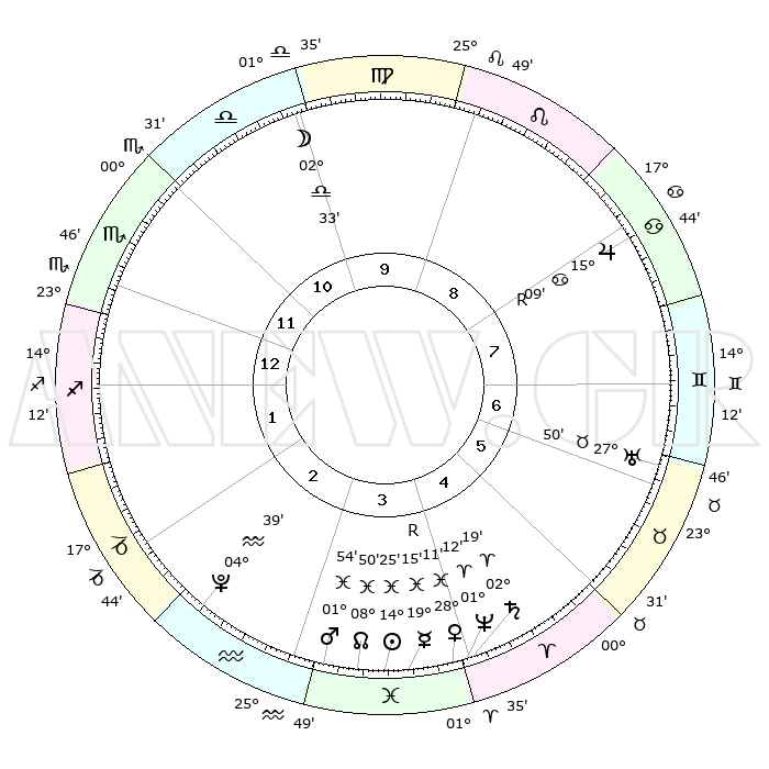 | | ΘΕΣΕΙΣ ΠΛΑΝΗΤΩΝ ΑΣΤΡΟΛΟΓΙΚΟΥ ΧΑΡΤΗ ΤΗΣ ΣΤΙΓΜΗΣ ΑΥΤΗΣ | | | | Πλανήτης | Ζώδιο | Μοίρες | Δεκαήμ. | Σε οίκο | Απόκλιση | | Ακμές των οίκων | | Ηλιος | Ιχθείς | 14°21' | Δεύτερο | 4 | 06 S 10 | | 1ος | 26°06' | Σκορπιός | | Σελήνη | Ζυγός | 01°46' | Πρώτο | 10 | 02 S 35 | | 2ος | 26°43' | Τοξότης | | Ερμής | Ιχθείς | 19°18'R | Δεύτερο | 4 | 00 S 51 | | 3ος | 01°48' | Υδροχόος | | Αφροδίτη | Ιχθείς | 28°07' | Τρίτο | 4 | 01 S 56 | | 4ος | 07°43' | Ιχθείς | | Αρης | Ιχθείς | 01°51' | Πρώτο | 3 | 11 S 50 | | 5ος | 09°12' | Κριός | | Δίας | Καρκίνος | 15°09'R | Δεύτερο | 8 | 22 N 55 | | 6ος | 04°47' | Ταύρος | | Κρόνος | Κριός | 02°19' | Πρώτο | 4 | 01 S 02 | | 7ος | 26°06' | Ταύρος | | Ουρανός | Ταύρος | 27°49' | Τρίτο | 7 | 19 N 30 | | 8ος | 26°43' | Δίδυμοι | | Ποσειδώνας | Κριός | 01°12' | Πρώτο | 4 | 00 S 44 | | 9ος | 01°48' | Λέων | | Πλούτωνας | Υδροχόος | 04°38' | Πρώτο | 3 | 22 S 51 | | 10ος | 07°43' | Παρθένος | | Β. Δεσμός | Ιχθείς | 08°50' | Πρώτο | 4 | 08 S 15 | | 11ος | 09°12' | Ζυγός | | Ωροσκόπος | Σκορπιός | 26°06' | Τρίτο | | | 12ος | 04°47' | Σκορπιός | | Μεσουράνημα | Παρθένος | 07°43' | Πρώτο | | | |
