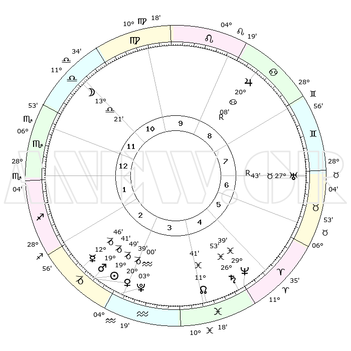 | | ΘΕΣΕΙΣ ΠΛΑΝΗΤΩΝ ΑΣΤΡΟΛΟΓΙΚΟΥ ΧΑΡΤΗ ΤΗΣ ΣΤΙΓΜΗΣ ΑΥΤΗΣ | | | | Πλανήτης | Ζώδιο | Μοίρες | Δεκαήμ. | Σε οίκο | Απόκλιση | | Ακμές των οίκων | | Ηλιος | Αιγόκερως | 19°15' | Δεύτερο | 8 | 22 S 03 | | 1ος | 07°47' | Δίδυμοι | | Σελήνη | Ζυγός | 06°24' | Πρώτο | 5 | 04 S 37 | | 2ος | 01°09' | Καρκίνος | | Ερμής | Αιγόκερως | 11°52' | Δεύτερο | 8 | 24 S 18 | | 3ος | 22°23' | Καρκίνος | | Αφροδίτη | Αιγόκερως | 19°56' | Δεύτερο | 8 | 22 S 45 | | 4ος | 15°48' | Λέων | | Αρης | Αιγόκερως | 19°15' | Δεύτερο | 8 | 22 S 59 | | 5ος | 15°40' | Παρθένος | | Δίας | Καρκίνος | 20°13'R | Τρίτο | 2 | 22 N 10 | | 6ος | 25°10' | Ζυγός | | Κρόνος | Ιχθείς | 26°50' | Τρίτο | 11 | 03 S 18 | | 7ος | 07°47' | Τοξότης | | Ουρανός | Ταύρος | 27°44'R | Τρίτο | 12 | 19 N 28 | | 8ος | 01°09' | Αιγόκερως | | Ποσειδώνας | Ιχθείς | 29°38' | Τρίτο | 11 | 01 S 22 | | 9ος | 22°23' | Αιγόκερως | | Πλούτωνας | Υδροχόος | 02°59' | Πρώτο | 9 | 23 S 10 | | 10ος | 15°48' | Υδροχόος | | Β. Δεσμός | Ιχθείς | 11°43' | Δεύτερο | 10 | 07 S 10 | | 11ος | 15°40' | Ιχθείς | | Ωροσκόπος | Δίδυμοι | 07°47' | Πρώτο | | | 12ος | 25°10' | Κριός | | Μεσουράνημα | Υδροχόος | 15°48' | Δεύτερο | | | |