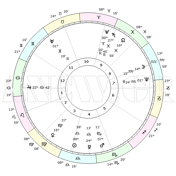 | ΘΕΣΕΙΣ ΠΛΑΝΗΤΩΝ ΑΣΤΡΟΛΟΓΙΚΟΥ ΧΑΡΤΗ ΤΗΣ ΣΤΙΓΜΗΣ ΑΥΤΗΣ | | Πλανήτης | Ζώδιο | Μοίρες | Δεκαήμ. | Σε οίκο | Απόκλιση | | Ακμές των οίκων | Ηλιος | Ζυγός | 09°54' | Πρώτο | 4 | 03 S 55 | | 1ος | 02°03' | Καρκίνος | Σελήνη | Υδροχόος | 13°20' | Δεύτερο | 8 | 19 S 42 | | 2ος | 22°44' | Καρκίνος | Ερμής | Ζυγός | 24°07' | Τρίτο | 5 | 09 S 39 | | 3ος | 14°41' | Λέων | Αφροδίτη | Παρθένος | 16°22' | Δεύτερο | 4 | 06 N 36 | | 4ος | 11°19' | Παρθένος | Αρης | Σκορπιός | 07°08' | Πρώτο | 5 | 13 S 59 | | 5ος | 15°35' | Ζυγός | Δίας | Καρκίνος | 22°41' | Τρίτο | 1 | 21 N 33 | | 6ος | 25°25' | Σκορπιός | Κρόνος | Ιχθείς | 27°45'R | Τρίτο | 10 | 03 S 12 | | 7ος | 02°03' | Αιγόκερως | Ουρανός | Δίδυμοι | 01°10'R | Πρώτο | 12 | 20 N 11 | | 8ος | 22°44' | Αιγόκερως | Ποσειδώνας | Κριός | 00°30'R | Πρώτο | 10 | 01 S 04 | | 9ος | 14°41' | Υδροχόος | Πλούτωνας | Υδροχόος | 01°24'R | Πρώτο | 8 | 23 S 32 | | 10ος | 11°19' | Ιχθείς | Β. Δεσμός | Ιχθείς | 16°57' | Δεύτερο | 10 | 05 S 09 | | 11ος | 15°35' | Κριός | Ωροσκόπος | Καρκίνος | 02°03' | Πρώτο | | | 12ος | 25°25' | Ταύρος | Μεσουράνημα | Ιχθείς | 11°19' | Δεύτερο | | | |
