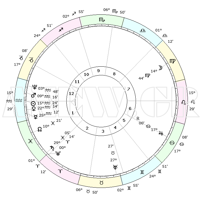 | | ΘΕΣΕΙΣ ΠΛΑΝΗΤΩΝ ΑΣΤΡΟΛΟΓΙΚΟΥ ΧΑΡΤΗ ΤΗΣ ΣΤΙΓΜΗΣ ΑΥΤΗΣ | | | | Πλανήτης | Ζώδιο | Μοίρες | Δεκαήμ. | Σε οίκο | Απόκλιση | | Ακμές των οίκων | | Ηλιος | Υδροχόος | 15°21' | Δεύτερο | 1 | 16 S 14 | | 1ος | 24°31' | Αιγόκερως | | Σελήνη | Παρθένος | 14°06' | Δεύτερο | 8 | 05 N 50 | | 2ος | 07°37' | Ιχθείς | | Ερμής | Υδροχόος | 25°07' | Τρίτο | 1 | 14 S 41 | | 3ος | 16°50' | Κριός | | Αφροδίτη | Υδροχόος | 22°11' | Τρίτο | 1 | 15 S 26 | | 4ος | 16°17' | Ταύρος | | Αρης | Υδροχόος | 09°14' | Πρώτο | 1 | 18 S 57 | | 5ος | 09°29' | Δίδυμοι | | Δίας | Καρκίνος | 17°01'R | Δεύτερο | 6 | 22 N 39 | | 6ος | 00°45' | Καρκίνος | | Κρόνος | Ιχθείς | 29°04' | Τρίτο | 2 | 02 S 21 | | 7ος | 24°31' | Καρκίνος | | Ουρανός | Ταύρος | 27°27' | Τρίτο | 4 | 19 N 24 | | 8ος | 07°37' | Παρθένος | | Ποσειδώνας | Κριός | 00°14' | Πρώτο | 2 | 01 S 07 | | 9ος | 16°50' | Ζυγός | | Πλούτωνας | Υδροχόος | 03°48' | Πρώτο | 1 | 23 S 00 | | 10ος | 16°17' | Σκορπιός | | Β. Δεσμός | Ιχθείς | 10°22' | Δεύτερο | 2 | 07 S 41 | | 11ος | 09°29' | Τοξότης | | Ωροσκόπος | Αιγόκερως | 24°31' | Τρίτο | | | 12ος | 00°45' | Αιγόκερως | | Μεσουράνημα | Σκορπιός | 16°17' | Δεύτερο | | | |