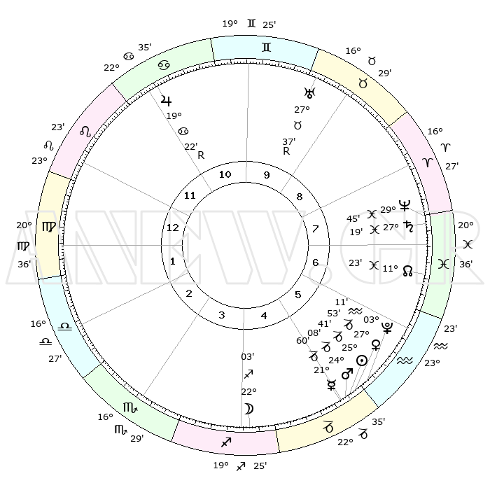 | | ΘΕΣΕΙΣ ΠΛΑΝΗΤΩΝ ΑΣΤΡΟΛΟΓΙΚΟΥ ΧΑΡΤΗ ΤΗΣ ΣΤΙΓΜΗΣ ΑΥΤΗΣ | | | | Πλανήτης | Ζώδιο | Μοίρες | Δεκαήμ. | Σε οίκο | Απόκλιση | | Ακμές των οίκων | | Ηλιος | Αιγόκερως | 25°38' | Τρίτο | 5 | 21 S 01 | | 1ος | 03°17' | Παρθένος | | Σελήνη | Τοξότης | 21°20' | Τρίτο | 4 | 28 S 10 | | 2ος | 27°29' | Παρθένος | | Ερμής | Αιγόκερως | 21°54' | Τρίτο | 5 | 23 S 27 | | 3ος | 26°27' | Ζυγός | | Αφροδίτη | Αιγόκερως | 27°48' | Τρίτο | 5 | 21 S 35 | | 4ος | 29°23' | Σκορπιός | | Αρης | Αιγόκερως | 24°05' | Τρίτο | 5 | 22 S 15 | | 5ος | 03°22' | Αιγόκερως | | Δίας | Καρκίνος | 19°23'R | Δεύτερο | 11 | 22 N 18 | | 6ος | 05°04' | Υδροχόος | | Κρόνος | Ιχθείς | 27°18' | Τρίτο | 7 | 03 S 06 | | 7ος | 03°17' | Ιχθείς | | Ουρανός | Ταύρος | 27°37'R | Τρίτο | 9 | 19 N 26 | | 8ος | 27°29' | Ιχθείς | | Ποσειδώνας | Ιχθείς | 29°45' | Τρίτο | 8 | 01 S 19 | | 9ος | 26°27' | Κριός | | Πλούτωνας | Υδροχόος | 03°11' | Πρώτο | 5 | 23 S 07 | | 10ος | 29°23' | Ταύρος | | Β. Δεσμός | Ιχθείς | 11°23' | Δεύτερο | 7 | 07 S 18 | | 11ος | 03°22' | Καρκίνος | | Ωροσκόπος | Παρθένος | 03°17' | Πρώτο | | | 12ος | 05°04' | Λέων | | Μεσουράνημα | Ταύρος | 29°23' | Τρίτο | | | |