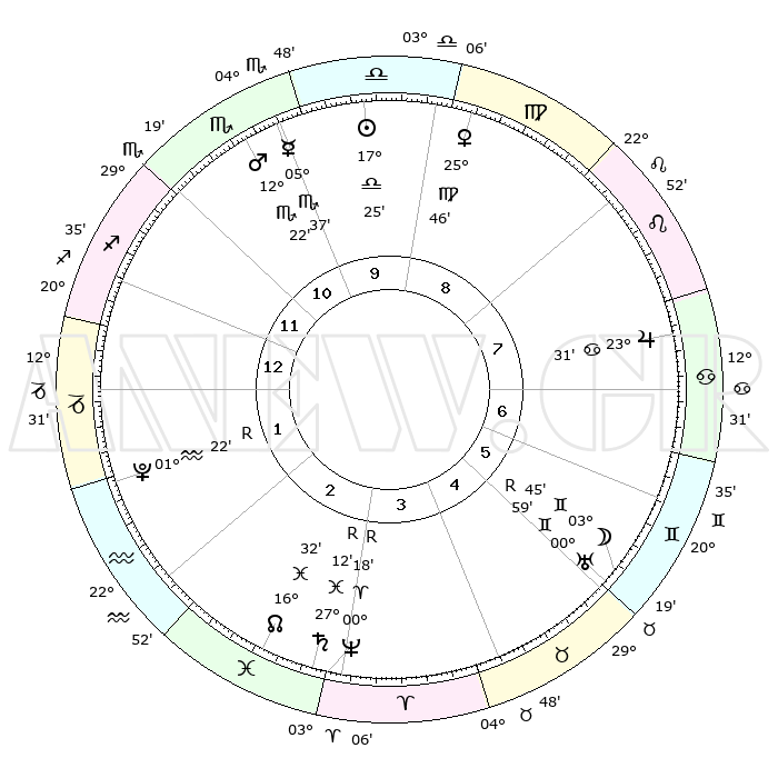 | ΘΕΣΕΙΣ ΠΛΑΝΗΤΩΝ ΑΣΤΡΟΛΟΓΙΚΟΥ ΧΑΡΤΗ ΤΗΣ ΣΤΙΓΜΗΣ ΑΥΤΗΣ | | Πλανήτης | Ζώδιο | Μοίρες | Δεκαήμ. | Σε οίκο | Απόκλιση | | Ακμές των οίκων | Ηλιος | Ζυγός | 17°09' | Δεύτερο | 12 | 06 S 44 | | 1ος | 22°50' | Ζυγός | Σελήνη | Ταύρος | 29°51' | Τρίτο | 8 | 24 N 57 | | 2ος | 20°49' | Σκορπιός | Ερμής | Σκορπιός | 05°14' | Πρώτο | 1 | 14 S 23 | | 3ος | 22°17' | Τοξότης | Αφροδίτη | Παρθένος | 25°27' | Τρίτο | 11 | 03 N 09 | | 4ος | 26°01' | Αιγόκερως | Αρης | Σκορπιός | 12°11' | Δεύτερο | 1 | 15 S 39 | | 5ος | 28°59' | Υδροχόος | Δίας | Καρκίνος | 23°29' | Τρίτο | 9 | 21 N 26 | | 6ος | 28°14' | Ιχθείς | Κρόνος | Ιχθείς | 27°13'R | Τρίτο | 5 | 03 S 24 | | 7ος | 22°50' | Κριός | Ουρανός | Δίδυμοι | 00°59'R | Πρώτο | 8 | 20 N 09 | | 8ος | 20°49' | Ταύρος | Ποσειδώνας | Κριός | 00°18'R | Πρώτο | 6 | 01 S 09 | | 9ος | 22°17' | Δίδυμοι | Πλούτωνας | Υδροχόος | 01°22'R | Πρώτο | 4 | 23 S 32 | | 10ος | 26°01' | Καρκίνος | Β. Δεσμός | Ιχθείς | 16°33' | Δεύτερο | 5 | 05 S 18 | | 11ος | 28°59' | Λέων | Ωροσκόπος | Ζυγός | 22°50' | Τρίτο | | | 12ος | 28°14' | Παρθένος | Μεσουράνημα | Καρκίνος | 26°01' | Τρίτο | | | |
