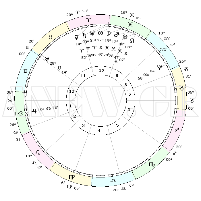 | | ΘΕΣΕΙΣ ΠΛΑΝΗΤΩΝ ΑΣΤΡΟΛΟΓΙΚΟΥ ΧΑΡΤΗ ΤΗΣ ΣΤΙΓΜΗΣ ΑΥΤΗΣ | | | | Πλανήτης | Ζώδιο | Μοίρες | Δεκαήμ. | Σε οίκο | Απόκλιση | | Ακμές των οίκων | | Ηλιος | Ιχθείς | 27°44' | Τρίτο | 11 | 00 S 54 | | 1ος | 09°32' | Δίδυμοι | | Σελήνη | Ιχθείς | 18°26' | Δεύτερο | 11 | 03 S 47 | | 2ος | 02°36' | Καρκίνος | | Ερμής | Ιχθείς | 08°48'R | Πρώτο | 10 | 06 S 47 | | 3ος | 23°49' | Καρκίνος | | Αφροδίτη | Κριός | 14°46' | Δεύτερο | 11 | 04 N 57 | | 4ος | 17°25' | Λέων | | Αρης | Ιχθείς | 12°24' | Δεύτερο | 10 | 07 S 54 | | 5ος | 17°36' | Παρθένος | | Δίας | Καρκίνος | 15°10' | Δεύτερο | 2 | 22 N 56 | | 6ος | 27°17' | Ζυγός | | Κρόνος | Κριός | 03°57' | Πρώτο | 11 | 00 S 23 | | 7ος | 09°32' | Τοξότης | | Ουρανός | Ταύρος | 28°14' | Τρίτο | 12 | 19 N 35 | | 8ος | 02°36' | Αιγόκερως | | Ποσειδώνας | Κριός | 01°42' | Πρώτο | 11 | 00 S 32 | | 9ος | 23°49' | Αιγόκερως | | Πλούτωνας | Υδροχόος | 04°58' | Πρώτο | 9 | 22 S 49 | | 10ος | 17°25' | Υδροχόος | | Β. Δεσμός | Ιχθείς | 08°08' | Πρώτο | 10 | 08 S 31 | | 11ος | 17°36' | Ιχθείς | | Ωροσκόπος | Δίδυμοι | 09°32' | Πρώτο | | | 12ος | 27°17' | Κριός | | Μεσουράνημα | Υδροχόος | 17°25' | Δεύτερο | | | |