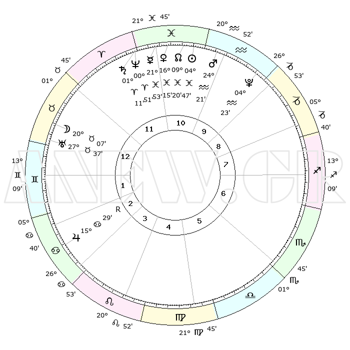| | ΘΕΣΕΙΣ ΠΛΑΝΗΤΩΝ ΑΣΤΡΟΛΟΓΙΚΟΥ ΧΑΡΤΗ ΤΗΣ ΣΤΙΓΜΗΣ ΑΥΤΗΣ | | | | Πλανήτης | Ζώδιο | Μοίρες | Δεκαήμ. | Σε οίκο | Απόκλιση | | Ακμές των οίκων | | Ηλιος | Ιχθείς | 04°43' | Πρώτο | 11 | 09 S 47 | | 1ος | 11°31' | Ταύρος | | Σελήνη | Ταύρος | 19°05' | Δεύτερο | 1 | 22 N 16 | | 2ος | 10°38' | Δίδυμοι | | Ερμής | Ιχθείς | 21°51' | Τρίτο | 11 | 01 S 18 | | 3ος | 03°08' | Καρκίνος | | Αφροδίτη | Ιχθείς | 16°09' | Δεύτερο | 11 | 06 S 47 | | 4ος | 24°60' | Καρκίνος | | Αρης | Υδροχόος | 24°17' | Τρίτο | 11 | 14 S 27 | | 5ος | 20°42' | Λέων | | Δίας | Καρκίνος | 15°29'R | Δεύτερο | 3 | 22 N 52 | | 6ος | 25°43' | Παρθένος | | Κρόνος | Κριός | 01°10' | Πρώτο | 12 | 01 S 30 | | 7ος | 11°31' | Σκορπιός | | Ουρανός | Ταύρος | 27°37' | Τρίτο | 1 | 19 N 27 | | 8ος | 10°38' | Τοξότης | | Ποσειδώνας | Κριός | 00°51' | Πρώτο | 12 | 00 S 52 | | 9ος | 03°08' | Αιγόκερως | | Πλούτωνας | Υδροχόος | 04°23' | Πρώτο | 10 | 22 S 54 | | 10ος | 24°60' | Αιγόκερως | | Β. Δεσμός | Ιχθείς | 09°21' | Πρώτο | 11 | 08 S 04 | | 11ος | 20°42' | Υδροχόος | | Ωροσκόπος | Ταύρος | 11°31' | Δεύτερο | | | 12ος | 25°43' | Ιχθείς | | Μεσουράνημα | Αιγόκερως | 24°60' | Τρίτο | | | |
