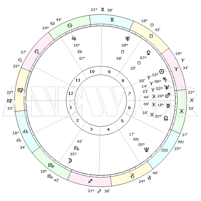 | | ΘΕΣΕΙΣ ΠΛΑΝΗΤΩΝ ΑΣΤΡΟΛΟΓΙΚΟΥ ΧΑΡΤΗ ΤΗΣ ΣΤΙΓΜΗΣ ΑΥΤΗΣ | | | | Πλανήτης | Ζώδιο | Μοίρες | Δεκαήμ. | Σε οίκο | Απόκλιση | | Ακμές των οίκων | | Ηλιος | Κριός | 15°37' | Δεύτερο | 10 | 06 N 09 | | 1ος | 18°25' | Καρκίνος | | Σελήνη | Σκορπιός | 23°03' | Τρίτο | 5 | 23 S 21 | | 2ος | 08°54' | Λέων | | Ερμής | Ιχθείς | 17°55' | Δεύτερο | 9 | 06 S 32 | | 3ος | 02°27' | Παρθένος | | Αφροδίτη | Ταύρος | 07°04' | Πρώτο | 10 | 13 N 38 | | 4ος | 01°49' | Ζυγός | | Αρης | Ιχθείς | 26°34' | Τρίτο | 9 | 02 S 18 | | 5ος | 07°44' | Σκορπιός | | Δίας | Καρκίνος | 16°06' | Δεύτερο | 12 | 22 N 50 | | 6ος | 15°24' | Τοξότης | | Κρόνος | Κριός | 06°12' | Πρώτο | 10 | 00 N 30 | | 7ος | 18°25' | Αιγόκερως | | Ουρανός | Ταύρος | 28°58' | Τρίτο | 11 | 19 N 45 | | 8ος | 08°54' | Υδροχόος | | Ποσειδώνας | Κριός | 02°22' | Πρώτο | 10 | 00 S 15 | | 9ος | 02°27' | Ιχθείς | | Πλούτωνας | Υδροχόος | 05°17' | Πρώτο | 7 | 22 S 47 | | 10ος | 01°49' | Κριός | | Β. Δεσμός | Ιχθείς | 07°10' | Πρώτο | 9 | 08 S 53 | | 11ος | 07°44' | Ταύρος | | Ωροσκόπος | Καρκίνος | 18°25' | Δεύτερο | | | 12ος | 15°24' | Δίδυμοι | | Μεσουράνημα | Κριός | 01°49' | Πρώτο | | | |