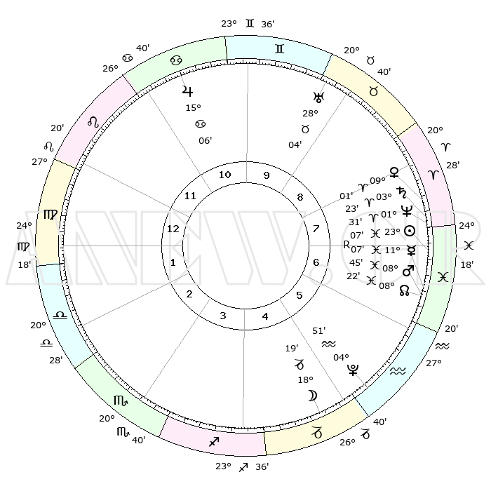 | | ΘΕΣΕΙΣ ΠΛΑΝΗΤΩΝ ΑΣΤΡΟΛΟΓΙΚΟΥ ΧΑΡΤΗ ΤΗΣ ΣΤΙΓΜΗΣ ΑΥΤΗΣ | | | | Πλανήτης | Ζώδιο | Μοίρες | Δεκαήμ. | Σε οίκο | Απόκλιση | | Ακμές των οίκων | | Ηλιος | Ιχθείς | 23°03' | Τρίτο | 7 | 02 S 46 | | 1ος | 04°32' | Παρθένος | | Σελήνη | Αιγόκερως | 17°30' | Δεύτερο | 5 | 26 S 23 | | 2ος | 28°51' | Παρθένος | | Ερμής | Ιχθείς | 11°10'R | Δεύτερο | 7 | 04 S 51 | | 3ος | 27°55' | Ζυγός | | Αφροδίτη | Κριός | 08°56' | Πρώτο | 8 | 02 N 32 | | 4ος | 00°52' | Τοξότης | | Αρης | Ιχθείς | 08°42' | Πρώτο | 7 | 09 S 19 | | 5ος | 04°45' | Αιγόκερως | | Δίας | Καρκίνος | 15°06' | Δεύτερο | 11 | 22 N 56 | | 6ος | 06°23' | Υδροχόος | | Κρόνος | Κριός | 03°22' | Πρώτο | 8 | 00 S 37 | | 7ος | 04°32' | Ιχθείς | | Ουρανός | Ταύρος | 28°04' | Τρίτο | 9 | 19 N 33 | | 8ος | 28°51' | Ιχθείς | | Ποσειδώνας | Κριός | 01°31' | Πρώτο | 8 | 00 S 36 | | 9ος | 27°55' | Κριός | | Πλούτωνας | Υδροχόος | 04°51' | Πρώτο | 5 | 22 S 50 | | 10ος | 00°52' | Δίδυμοι | | Β. Δεσμός | Ιχθείς | 08°23' | Πρώτο | 7 | 08 S 26 | | 11ος | 04°45' | Καρκίνος | | Ωροσκόπος | Παρθένος | 04°32' | Πρώτο | | | 12ος | 06°23' | Λέων | | Μεσουράνημα | Δίδυμοι | 00°52' | Πρώτο | | | |