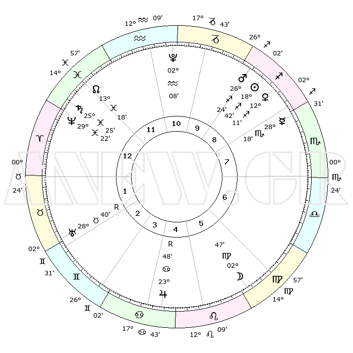 | | ΘΕΣΕΙΣ ΠΛΑΝΗΤΩΝ ΑΣΤΡΟΛΟΓΙΚΟΥ ΧΑΡΤΗ ΤΗΣ ΣΤΙΓΜΗΣ ΑΥΤΗΣ | | | | Πλανήτης | Ζώδιο | Μοίρες | Δεκαήμ. | Σε οίκο | Απόκλιση | | Ακμές των οίκων | | Ηλιος | Τοξότης | 18°39' | Δεύτερο | 9 | 22 S 57 | | 1ος | 04°20' | Κριός | | Σελήνη | Παρθένος | 02°11' | Πρώτο | 6 | 11 N 35 | | 2ος | 13°33' | Ταύρος | | Ερμής | Σκορπιός | 28°15' | Τρίτο | 8 | 17 S 45 | | 3ος | 10°18' | Δίδυμοι | | Αφροδίτη | Τοξότης | 12°07' | Δεύτερο | 9 | 21 S 54 | | 4ος | 02°26' | Καρκίνος | | Αρης | Τοξότης | 26°22' | Τρίτο | 9 | 24 S 07 | | 5ος | 24°57' | Καρκίνος | | Δίας | Καρκίνος | 23°48'R | Τρίτο | 4 | 21 N 31 | | 6ος | 23°02' | Λέων | | Κρόνος | Ιχθείς | 25°25' | Τρίτο | 12 | 03 S 58 | | 7ος | 04°20' | Ζυγός | | Ουρανός | Ταύρος | 28°40'R | Τρίτο | 2 | 19 N 40 | | 8ος | 13°33' | Σκορπιός | | Ποσειδώνας | Ιχθείς | 29°22' | Τρίτο | 12 | 01 S 29 | | 9ος | 10°18' | Τοξότης | | Πλούτωνας | Υδροχόος | 02°08' | Πρώτο | 11 | 23 S 21 | | 10ος | 02°26' | Αιγόκερως | | Β. Δεσμός | Ιχθείς | 13°19' | Δεύτερο | 12 | 06 S 33 | | 11ος | 24°57' | Αιγόκερως | | Ωροσκόπος | Κριός | 04°20' | Πρώτο | | | 12ος | 23°02' | Υδροχόος | | Μεσουράνημα | Αιγόκερως | 02°26' | Πρώτο | | | |