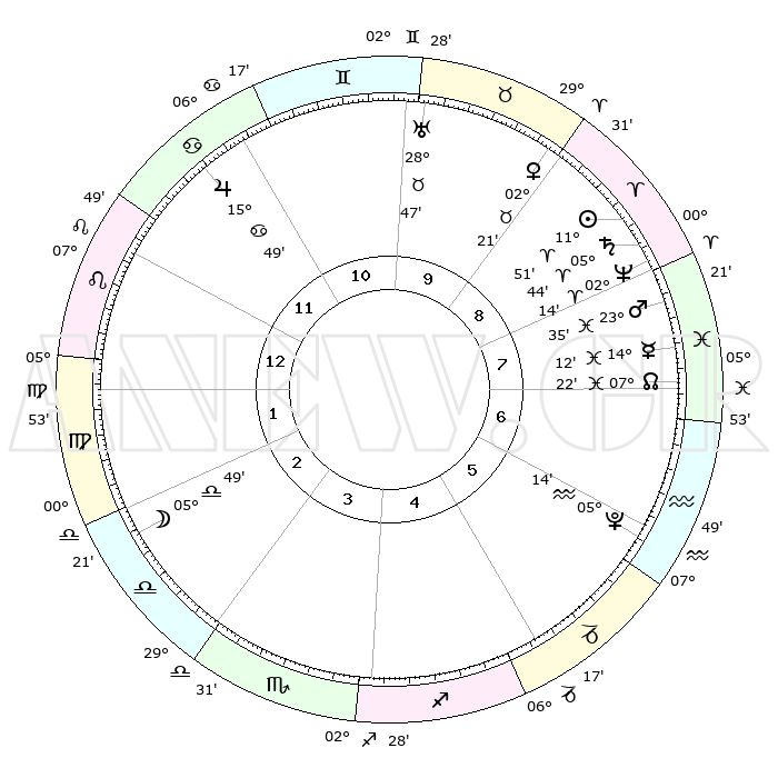 | | ΘΕΣΕΙΣ ΠΛΑΝΗΤΩΝ ΑΣΤΡΟΛΟΓΙΚΟΥ ΧΑΡΤΗ ΤΗΣ ΣΤΙΓΜΗΣ ΑΥΤΗΣ | | | | Πλανήτης | Ζώδιο | Μοίρες | Δεκαήμ. | Σε οίκο | Απόκλιση | | Ακμές των οίκων | | Ηλιος | Κριός | 11°47' | Δεύτερο | 9 | 04 N 39 | | 1ος | 16°19' | Λέων | | Σελήνη | Ζυγός | 04°57' | Πρώτο | 2 | 04 S 05 | | 2ος | 08°45' | Παρθένος | | Ερμής | Ιχθείς | 14°08' | Δεύτερο | 8 | 07 S 31 | | 3ος | 05°58' | Ζυγός | | Αφροδίτη | Ταύρος | 02°17' | Πρώτο | 9 | 11 N 52 | | 4ος | 08°27' | Σκορπιός | | Αρης | Ιχθείς | 23°31' | Τρίτο | 8 | 03 S 32 | | 5ος | 13°38' | Τοξότης | | Δίας | Καρκίνος | 15°49' | Δεύτερο | 11 | 22 N 52 | | 6ος | 16°57' | Αιγόκερως | | Κρόνος | Κριός | 05°44' | Πρώτο | 8 | 00 N 19 | | 7ος | 16°19' | Υδροχόος | | Ουρανός | Ταύρος | 28°47' | Τρίτο | 10 | 19 N 43 | | 8ος | 08°45' | Ιχθείς | | Ποσειδώνας | Κριός | 02°14' | Πρώτο | 8 | 00 S 19 | | 9ος | 05°58' | Κριός | | Πλούτωνας | Υδροχόος | 05°14' | Πρώτο | 6 | 22 S 47 | | 10ος | 08°27' | Ταύρος | | Β. Δεσμός | Ιχθείς | 07°23' | Πρώτο | 7 | 08 S 48 | | 11ος | 13°38' | Δίδυμοι | | Ωροσκόπος | Λέων | 16°19' | Δεύτερο | | | 12ος | 16°57' | Καρκίνος | | Μεσουράνημα | Ταύρος | 08°27' | Πρώτο | | | |