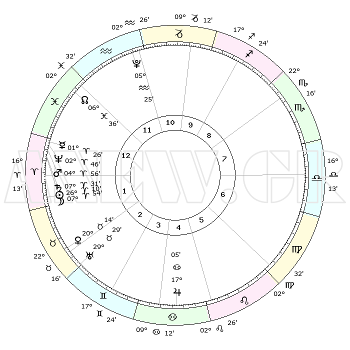 | | ΘΕΣΕΙΣ ΠΛΑΝΗΤΩΝ ΑΣΤΡΟΛΟΓΙΚΟΥ ΧΑΡΤΗ ΤΗΣ ΣΤΙΓΜΗΣ ΑΥΤΗΣ | | | | Πλανήτης | Ζώδιο | Μοίρες | Δεκαήμ. | Σε οίκο | Απόκλιση | | Ακμές των οίκων | | Ηλιος | Κριός | 26°06' | Τρίτο | 2 | 10 N 05 | | 1ος | 04°43' | Ιχθείς | | Σελήνη | Κριός | 06°53' | Πρώτο | 1 | 05 N 00 | | 2ος | 19°41' | Κριός | | Ερμής | Κριός | 01°20' | Πρώτο | 1 | 01 S 52 | | 3ος | 21°29' | Ταύρος | | Αφροδίτη | Ταύρος | 20°08' | Τρίτο | 2 | 17 N 59 | | 4ος | 15°26' | Δίδυμοι | | Αρης | Κριός | 04°52' | Πρώτο | 1 | 01 N 02 | | 5ος | 07°07' | Καρκίνος | | Δίας | Καρκίνος | 17°05' | Δεύτερο | 5 | 22 N 43 | | 6ος | 01°11' | Λέων | | Κρόνος | Κριός | 07°31' | Πρώτο | 1 | 01 N 01 | | 7ος | 04°43' | Παρθένος | | Ουρανός | Ταύρος | 29°29' | Τρίτο | 3 | 19 N 52 | | 8ος | 19°41' | Ζυγός | | Ποσειδώνας | Κριός | 02°46' | Πρώτο | 1 | 00 S 06 | | 9ος | 21°28' | Σκορπιός | | Πλούτωνας | Υδροχόος | 05°25' | Πρώτο | 12 | 22 S 47 | | 10ος | 15°26' | Τοξότης | | Β. Δεσμός | Ιχθείς | 06°36' | Πρώτο | 1 | 09 S 05 | | 11ος | 07°07' | Αιγόκερως | | Ωροσκόπος | Ιχθείς | 04°43' | Πρώτο | | | 12ος | 01°11' | Υδροχόος | | Μεσουράνημα | Τοξότης | 15°26' | Δεύτερο | | | |