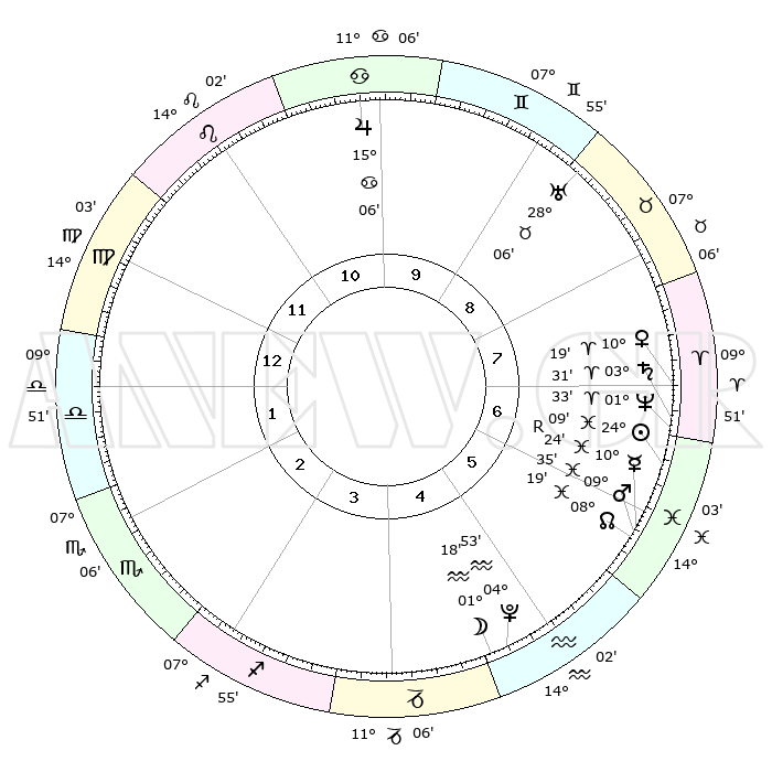 | | ΘΕΣΕΙΣ ΠΛΑΝΗΤΩΝ ΑΣΤΡΟΛΟΓΙΚΟΥ ΧΑΡΤΗ ΤΗΣ ΣΤΙΓΜΗΣ ΑΥΤΗΣ | | | | Πλανήτης | Ζώδιο | Μοίρες | Δεκαήμ. | Σε οίκο | Απόκλιση | | Ακμές των οίκων | | Ηλιος | Ιχθείς | 24°06' | Τρίτο | 7 | 02 S 21 | | 1ος | 21°01' | Παρθένος | | Σελήνη | Υδροχόος | 00°30' | Πρώτο | 5 | 23 S 15 | | 2ος | 16°54' | Ζυγός | | Ερμής | Ιχθείς | 10°26'R | Δεύτερο | 6 | 05 S 21 | | 3ος | 16°58' | Σκορπιός | | Αφροδίτη | Κριός | 10°14' | Δεύτερο | 7 | 03 N 05 | | 4ος | 19°53' | Τοξότης | | Αρης | Ιχθείς | 09°32' | Πρώτο | 6 | 09 S 00 | | 5ος | 23°03' | Αιγόκερως | | Δίας | Καρκίνος | 15°06' | Δεύτερο | 10 | 22 N 56 | | 6ος | 23°50' | Υδροχόος | | Κρόνος | Κριός | 03°30' | Πρώτο | 7 | 00 S 33 | | 7ος | 21°01' | Ιχθείς | | Ουρανός | Ταύρος | 28°06' | Τρίτο | 9 | 19 N 34 | | 8ος | 16°54' | Κριός | | Ποσειδώνας | Κριός | 01°33' | Πρώτο | 7 | 00 S 35 | | 9ος | 16°58' | Ταύρος | | Πλούτωνας | Υδροχόος | 04°53' | Πρώτο | 5 | 22 S 50 | | 10ος | 19°53' | Δίδυμοι | | Β. Δεσμός | Ιχθείς | 08°19' | Πρώτο | 6 | 08 S 27 | | 11ος | 23°03' | Καρκίνος | | Ωροσκόπος | Παρθένος | 21°01' | Τρίτο | | | 12ος | 23°50' | Λέων | | Μεσουράνημα | Δίδυμοι | 19°53' | Δεύτερο | | | |