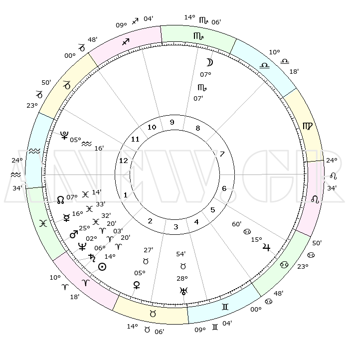 | | ΘΕΣΕΙΣ ΠΛΑΝΗΤΩΝ ΑΣΤΡΟΛΟΓΙΚΟΥ ΧΑΡΤΗ ΤΗΣ ΣΤΙΓΜΗΣ ΑΥΤΗΣ | | | | Πλανήτης | Ζώδιο | Μοίρες | Δεκαήμ. | Σε οίκο | Απόκλιση | | Ακμές των οίκων | | Ηλιος | Κριός | 14°16' | Δεύτερο | 2 | 05 N 38 | | 1ος | 26°30' | Αιγόκερως | | Σελήνη | Σκορπιός | 06°23' | Πρώτο | 9 | 17 S 46 | | 2ος | 09°59' | Ιχθείς | | Ερμής | Ιχθείς | 16°30' | Δεύτερο | 2 | 06 S 56 | | 3ος | 18°57' | Κριός | | Αφροδίτη | Ταύρος | 05°22' | Πρώτο | 3 | 13 N 01 | | 4ος | 18°01' | Ταύρος | | Αρης | Ιχθείς | 25°30' | Τρίτο | 2 | 02 S 44 | | 5ος | 11°04' | Δίδυμοι | | Δίας | Καρκίνος | 15°60' | Δεύτερο | 6 | 22 N 51 | | 6ος | 02°22' | Καρκίνος | | Κρόνος | Κριός | 06°02' | Πρώτο | 2 | 00 N 26 | | 7ος | 26°30' | Καρκίνος | | Ουρανός | Ταύρος | 28°54' | Τρίτο | 4 | 19 N 44 | | 8ος | 09°59' | Παρθένος | | Ποσειδώνας | Κριός | 02°19' | Πρώτο | 2 | 00 S 17 | | 9ος | 18°57' | Ζυγός | | Πλούτωνας | Υδροχόος | 05°16' | Πρώτο | 1 | 22 S 47 | | 10ος | 18°01' | Σκορπιός | | Β. Δεσμός | Ιχθείς | 07°15' | Πρώτο | 1 | 08 S 51 | | 11ος | 11°04' | Τοξότης | | Ωροσκόπος | Αιγόκερως | 26°30' | Τρίτο | | | 12ος | 02°22' | Αιγόκερως | | Μεσουράνημα | Σκορπιός | 18°01' | Δεύτερο | | | |