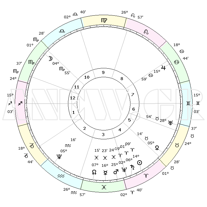 | | ΘΕΣΕΙΣ ΠΛΑΝΗΤΩΝ ΑΣΤΡΟΛΟΓΙΚΟΥ ΧΑΡΤΗ ΤΗΣ ΣΤΙΓΜΗΣ ΑΥΤΗΣ | | | | Πλανήτης | Ζώδιο | Μοίρες | Δεκαήμ. | Σε οίκο | Απόκλιση | | Ακμές των οίκων | | Ηλιος | Κριός | 14°06' | Δεύτερο | 5 | 05 N 33 | | 1ος | 27°30' | Σκορπιός | | Σελήνη | Σκορπιός | 04°12' | Πρώτο | 11 | 16 S 56 | | 2ος | 28°18' | Τοξότης | | Ερμής | Ιχθείς | 16°19' | Δεύτερο | 4 | 06 S 59 | | 3ος | 03°36' | Υδροχόος | | Αφροδίτη | Ταύρος | 05°09' | Πρώτο | 5 | 12 N 56 | | 4ος | 09°35' | Ιχθείς | | Αρης | Ιχθείς | 25°21' | Τρίτο | 4 | 02 S 48 | | 5ος | 10°54' | Κριός | | Δίας | Καρκίνος | 15°59' | Δεύτερο | 8 | 22 N 51 | | 6ος | 06°18' | Ταύρος | | Κρόνος | Κριός | 06°01' | Πρώτο | 4 | 00 N 26 | | 7ος | 27°30' | Ταύρος | | Ουρανός | Ταύρος | 28°53' | Τρίτο | 7 | 19 N 44 | | 8ος | 28°18' | Δίδυμοι | | Ποσειδώνας | Κριός | 02°19' | Πρώτο | 4 | 00 S 17 | | 9ος | 03°36' | Λέων | | Πλούτωνας | Υδροχόος | 05°16' | Πρώτο | 3 | 22 S 47 | | 10ος | 09°35' | Παρθένος | | Β. Δεσμός | Ιχθείς | 07°15' | Πρώτο | 3 | 08 S 51 | | 11ος | 10°54' | Ζυγός | | Ωροσκόπος | Σκορπιός | 27°30' | Τρίτο | | | 12ος | 06°18' | Σκορπιός | | Μεσουράνημα | Παρθένος | 09°35' | Πρώτο | | | |