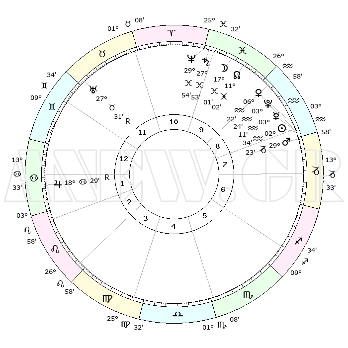 | | ΘΕΣΕΙΣ ΠΛΑΝΗΤΩΝ ΑΣΤΡΟΛΟΓΙΚΟΥ ΧΑΡΤΗ ΤΗΣ ΣΤΙΓΜΗΣ ΑΥΤΗΣ | | | | Πλανήτης | Ζώδιο | Μοίρες | Δεκαήμ. | Σε οίκο | Απόκλιση | | Ακμές των οίκων | | Ηλιος | Υδροχόος | 02°29' | Πρώτο | 8 | 19 S 36 | | 1ος | 19°50' | Δίδυμοι | | Σελήνη | Ιχθείς | 16°03' | Δεύτερο | 10 | 04 S 56 | | 2ος | 11°30' | Καρκίνος | | Ερμής | Υδροχόος | 03°04' | Πρώτο | 9 | 21 S 29 | | 3ος | 02°49' | Λέων | | Αφροδίτη | Υδροχόος | 06°16' | Πρώτο | 9 | 19 S 50 | | 4ος | 27°38' | Λέων | | Αρης | Αιγόκερως | 29°20' | Τρίτο | 8 | 21 S 16 | | 5ος | 29°47' | Παρθένος | | Δίας | Καρκίνος | 18°30'R | Δεύτερο | 2 | 22 N 26 | | 6ος | 10°04' | Σκορπιός | | Κρόνος | Ιχθείς | 27°52' | Τρίτο | 10 | 02 S 52 | | 7ος | 19°50' | Τοξότης | | Ουρανός | Ταύρος | 27°31'R | Τρίτο | 12 | 19 N 25 | | 8ος | 11°30' | Αιγόκερως | | Ποσειδώνας | Ιχθείς | 29°54' | Τρίτο | 11 | 01 S 15 | | 9ος | 02°49' | Υδροχόος | | Πλούτωνας | Υδροχόος | 03°24' | Πρώτο | 9 | 23 S 05 | | 10ος | 27°38' | Υδροχόος | | Β. Δεσμός | Ιχθείς | 11°02' | Δεύτερο | 10 | 07 S 26 | | 11ος | 29°47' | Ιχθείς | | Ωροσκόπος | Δίδυμοι | 19°50' | Δεύτερο | | | 12ος | 10°05' | Ταύρος | | Μεσουράνημα | Υδροχόος | 27°38' | Τρίτο | | | |